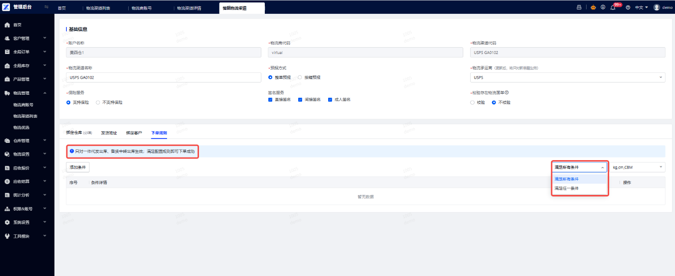 下单规则(可选):点击物流管理-物流商渠道列表,选择需配置的物流渠道,在右侧点击编辑,点击下单规则。注意:给渠道设置下单规则限制,仅对一件代发、备货中转出库单生效;当满足条件时,则可以下单,不满足将会进入OMS-异常中,并展示对应渠道的下单限制。支持同时配置多个条件。