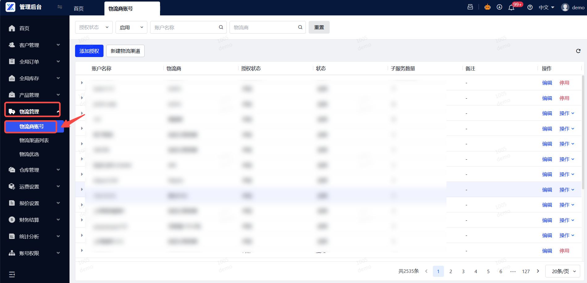 (1)进入OMP管理后台: 登录您的OMP,导航至物流管理菜单展开,点击物流商账号。