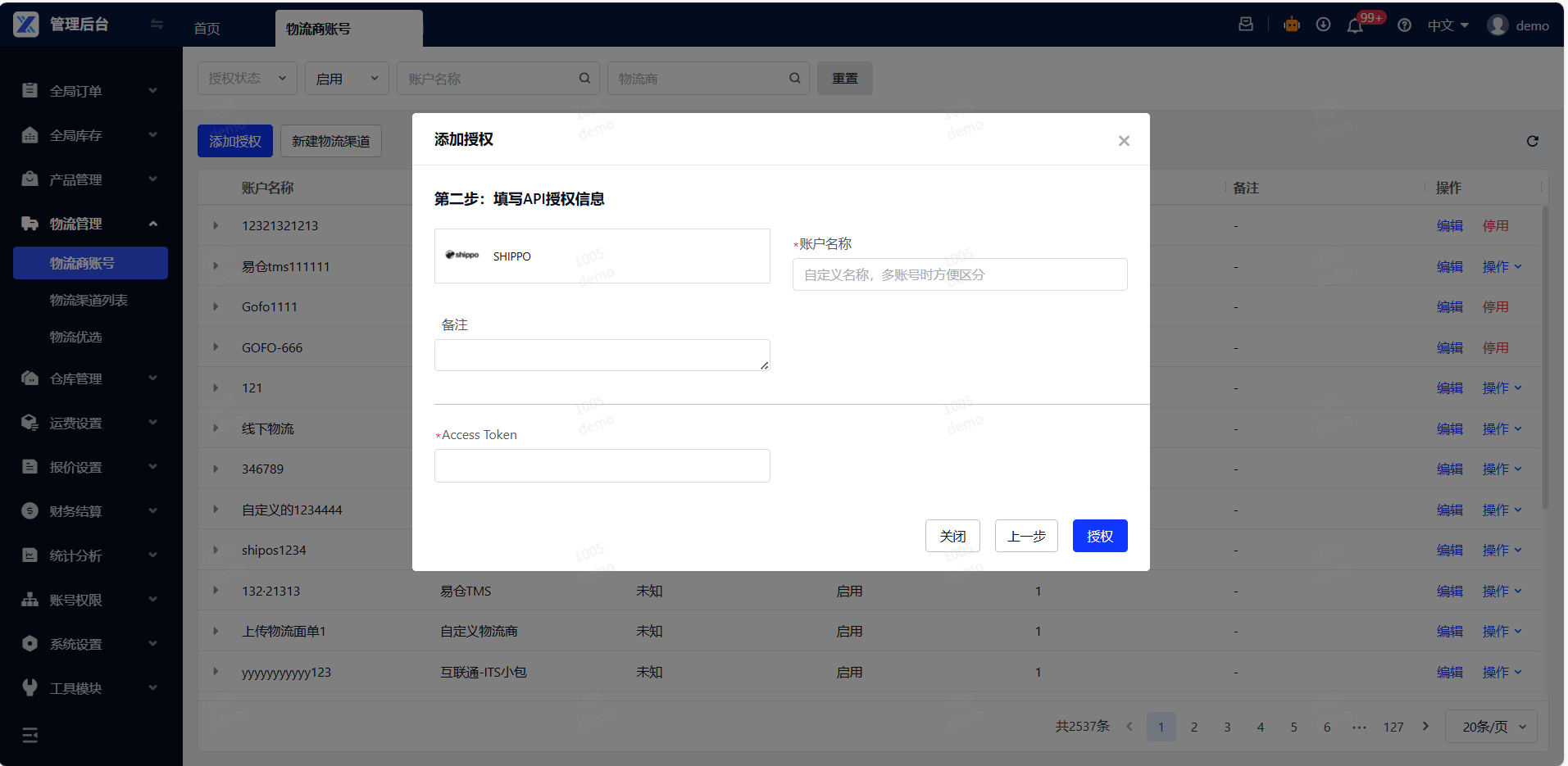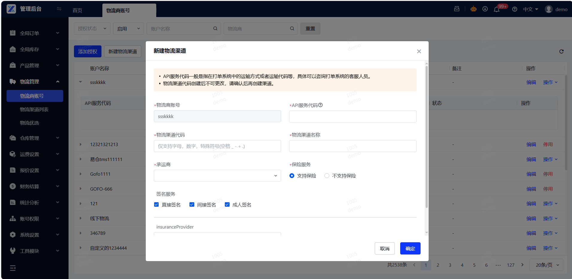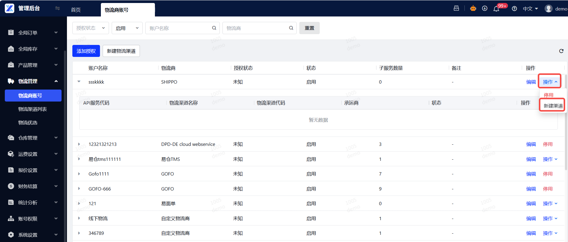 - 物流商账号:用于授权的官方接口、打单系统的导航栏,也可以创建自定义的渠道。