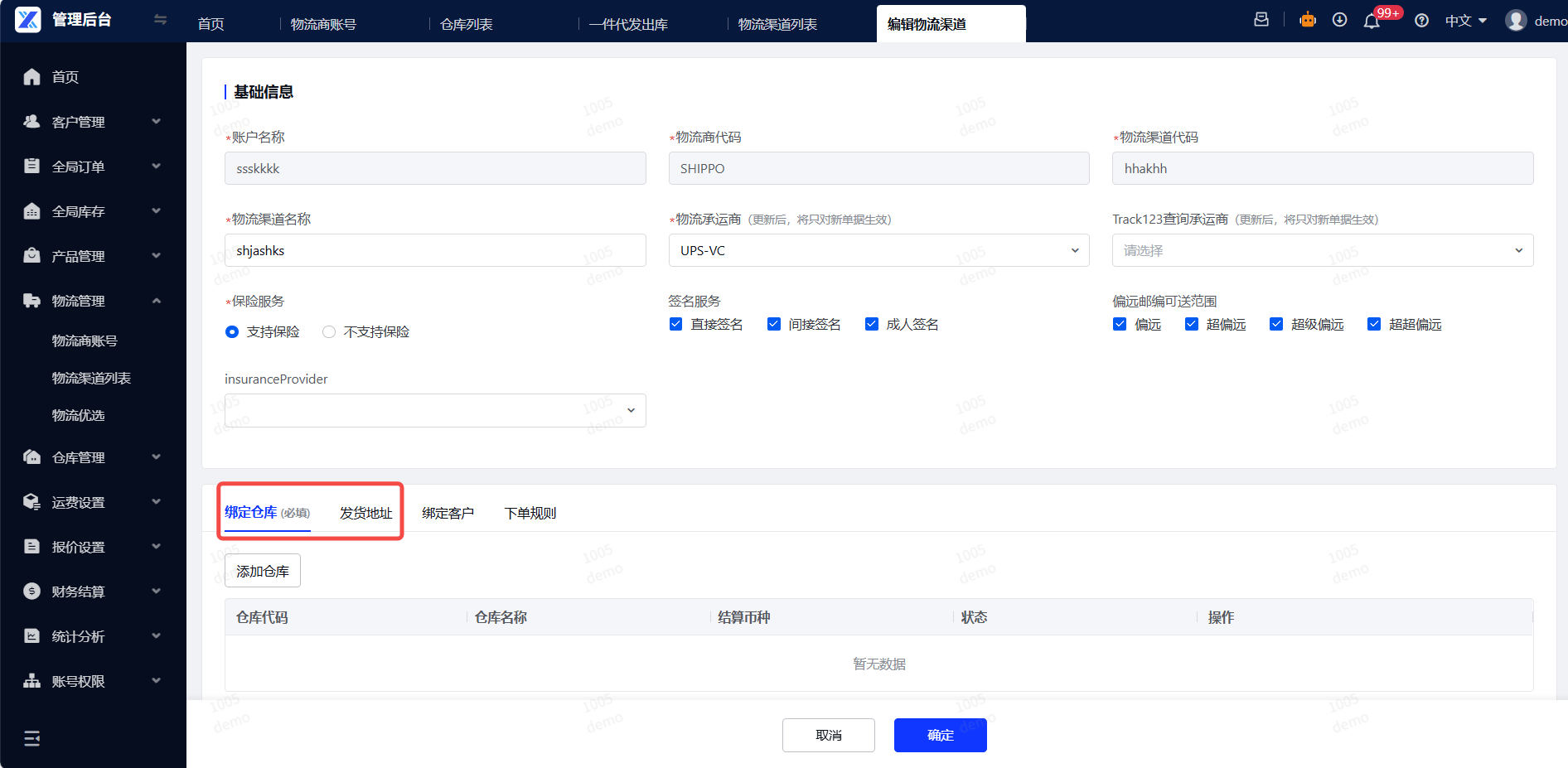 (5)编辑物流渠道:来到物流渠道列表,提供物流渠道代码和物流渠道列表找到刚才创建好的物流渠道,点击编辑。绑定仓库,绑定仓库用于指定该渠道可使用的仓库;发货地址指定该渠道不同仓库对应的发货地址,可以与仓库地址一致,地址填写中的服务商地址编码填写shippo后台Carrier accounts界面的OBJECT ID。