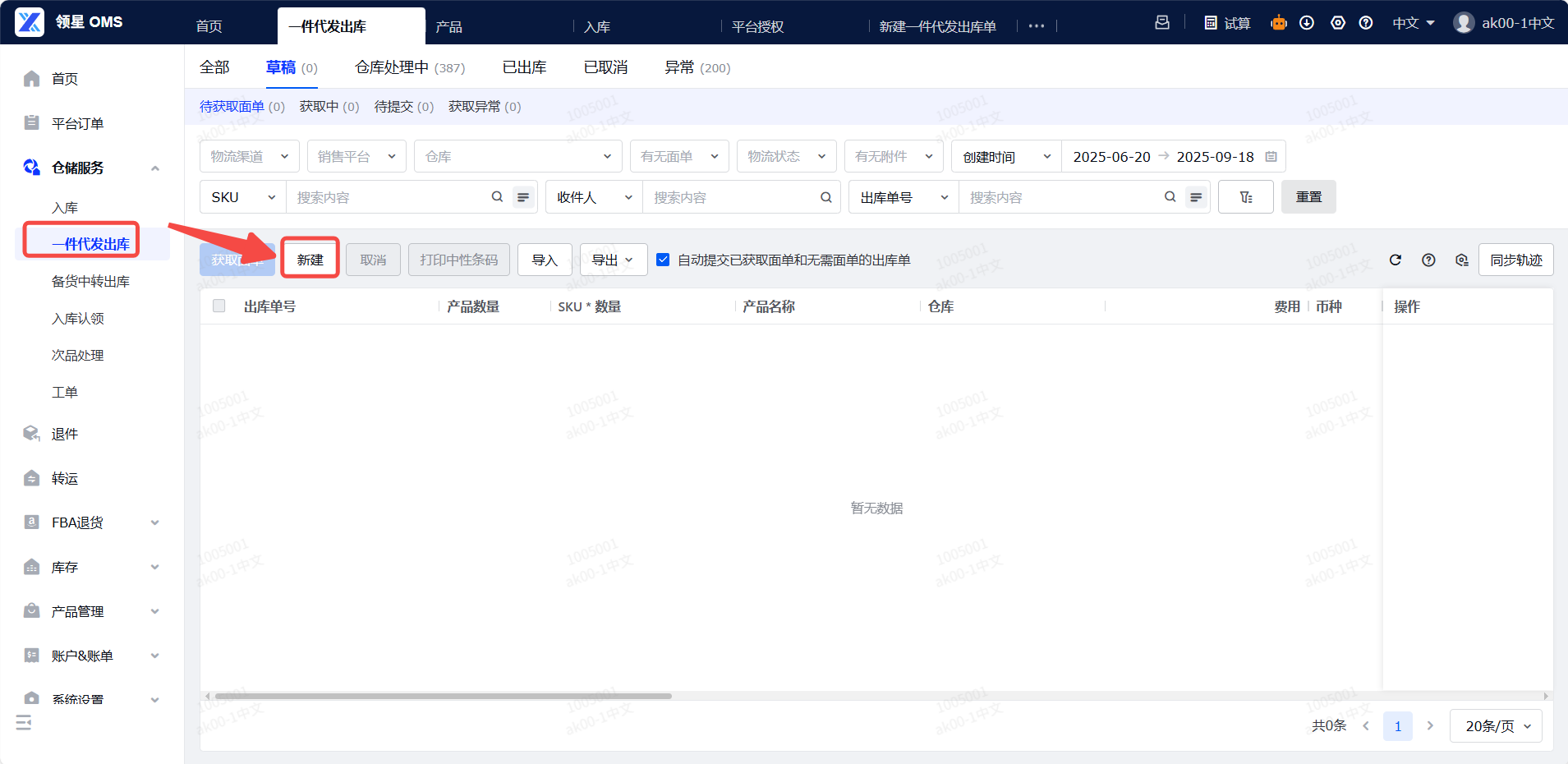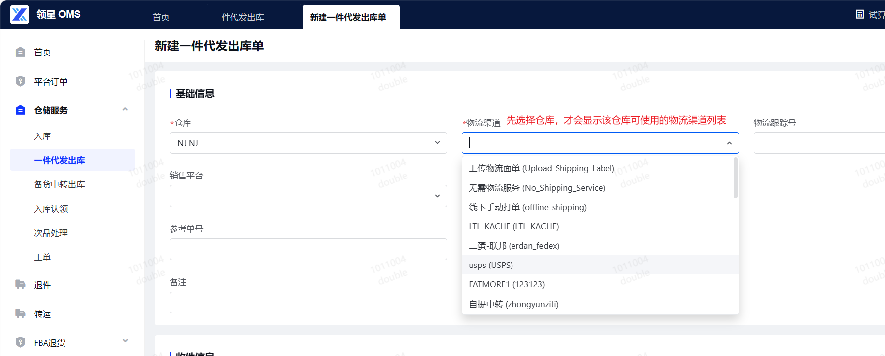 (6)OMS下单使用已授权渠道:刚授权的物流商账号,授权状态仍为“未知”,在OMS创建单据成功获取面单后会自动更新为“授权成功”。在OMS > 仓储服务 > 一件代发出库 > 新建 > 填写单据信息 > 提交 > 草稿 > 待获取面单 > 获取面单。获取面单提示异常,若为【物流商系统返回】开头,需联系复制报文联系shippo确认报错原因。