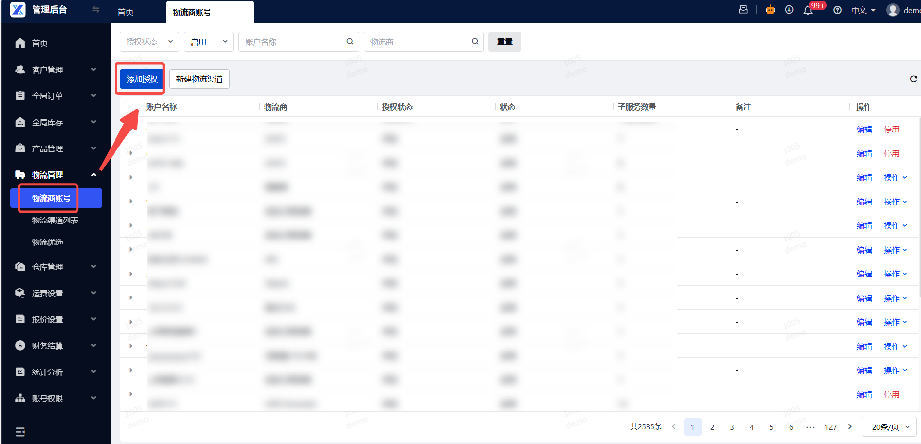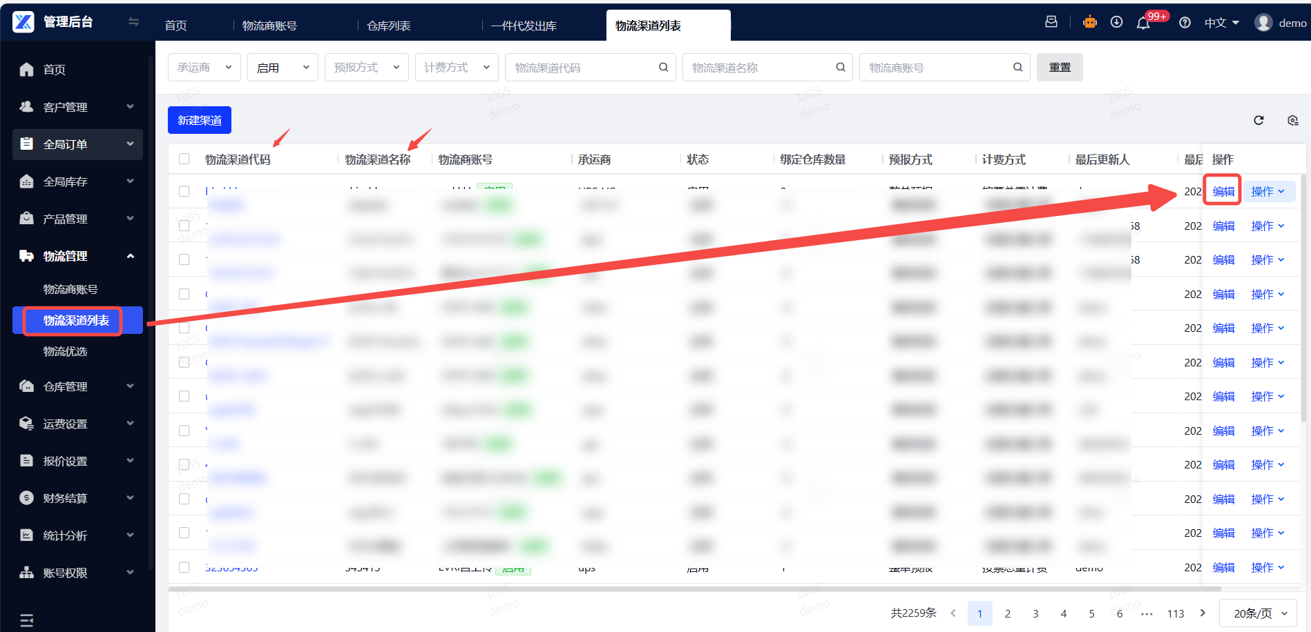 - 物流渠道列表:用于展示所有在授权完物流商账号后创建的物流渠道,也就是oms客户可以选择到的物流渠道。