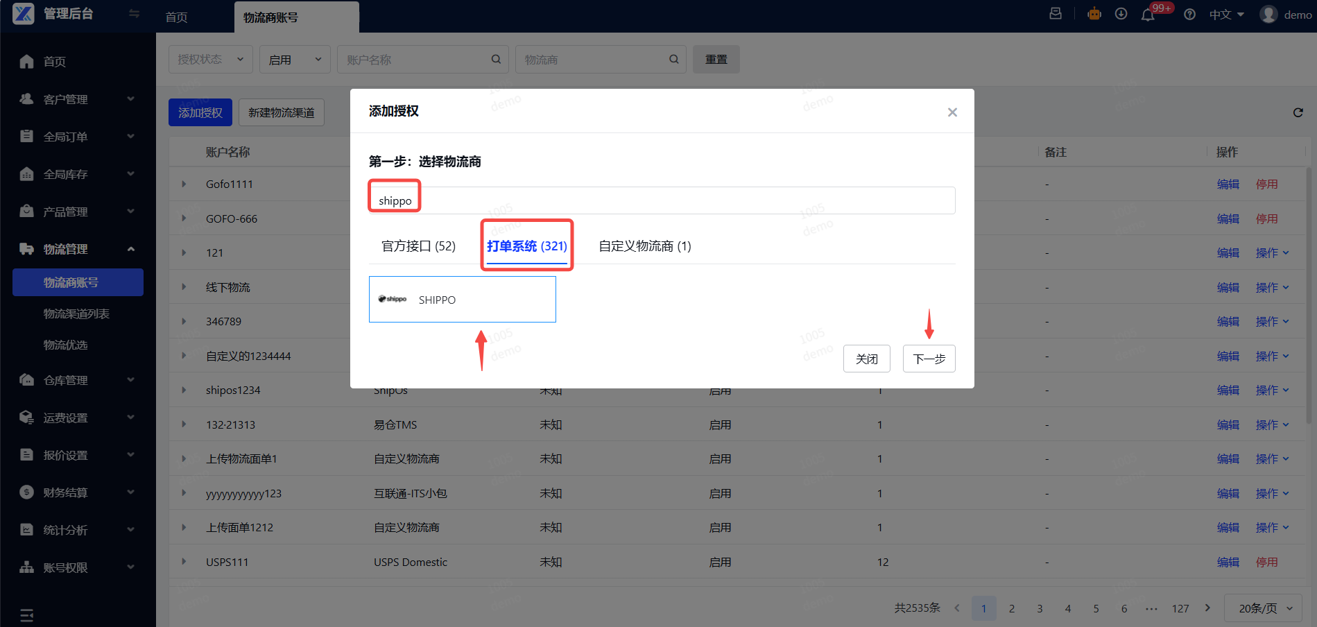 (2)选择物流商shippo:点击添加授权,在弹出来的界面中选中打单系统一栏,搜索shippo找到对应物流商并点击选择,然后点击下一步。
