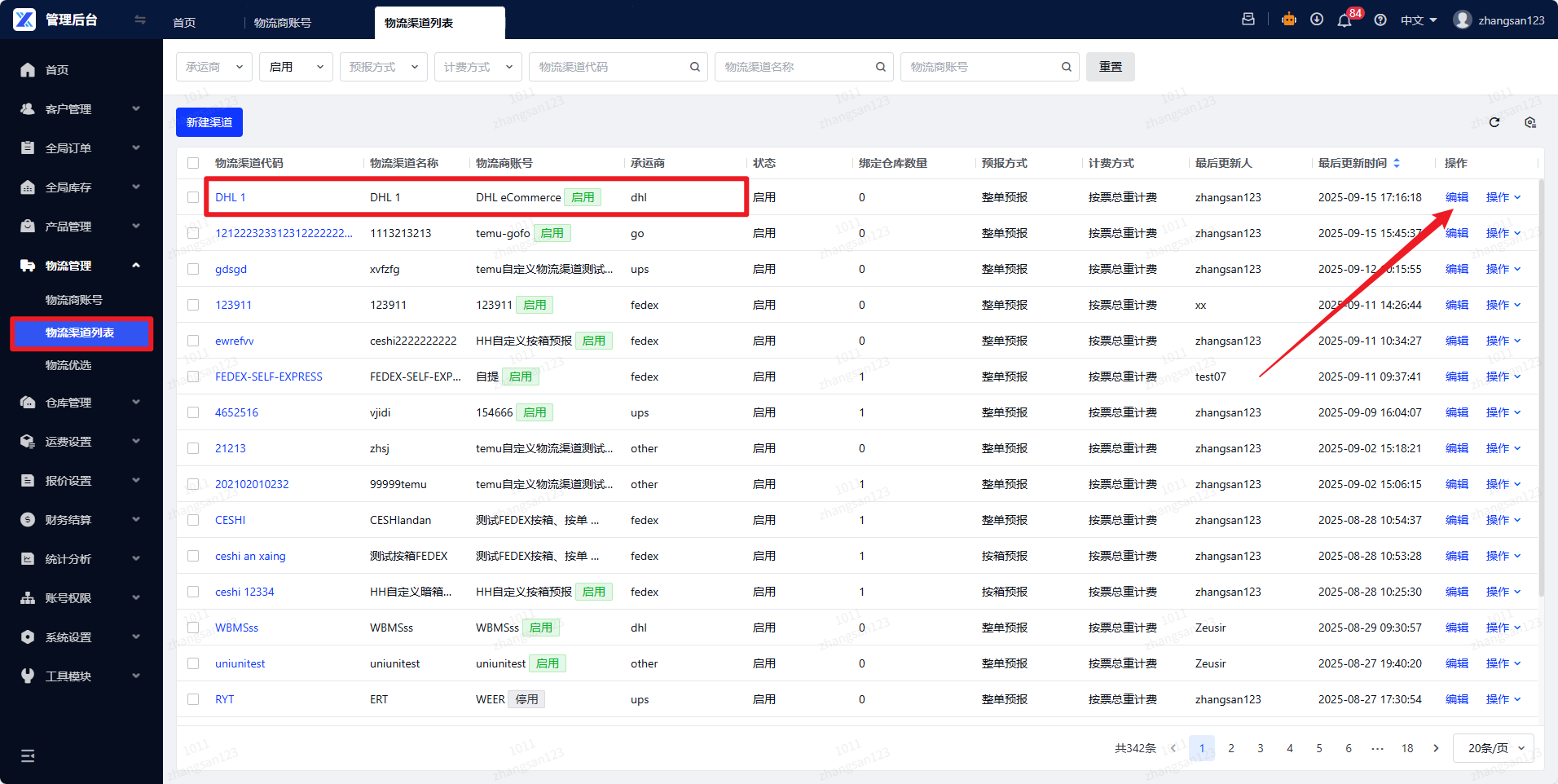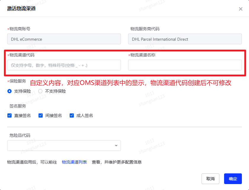 - 物流渠道代码和物流渠道名称是自定义的,OMS渠道列表中对应显示,物流渠道代码创建后不可修改