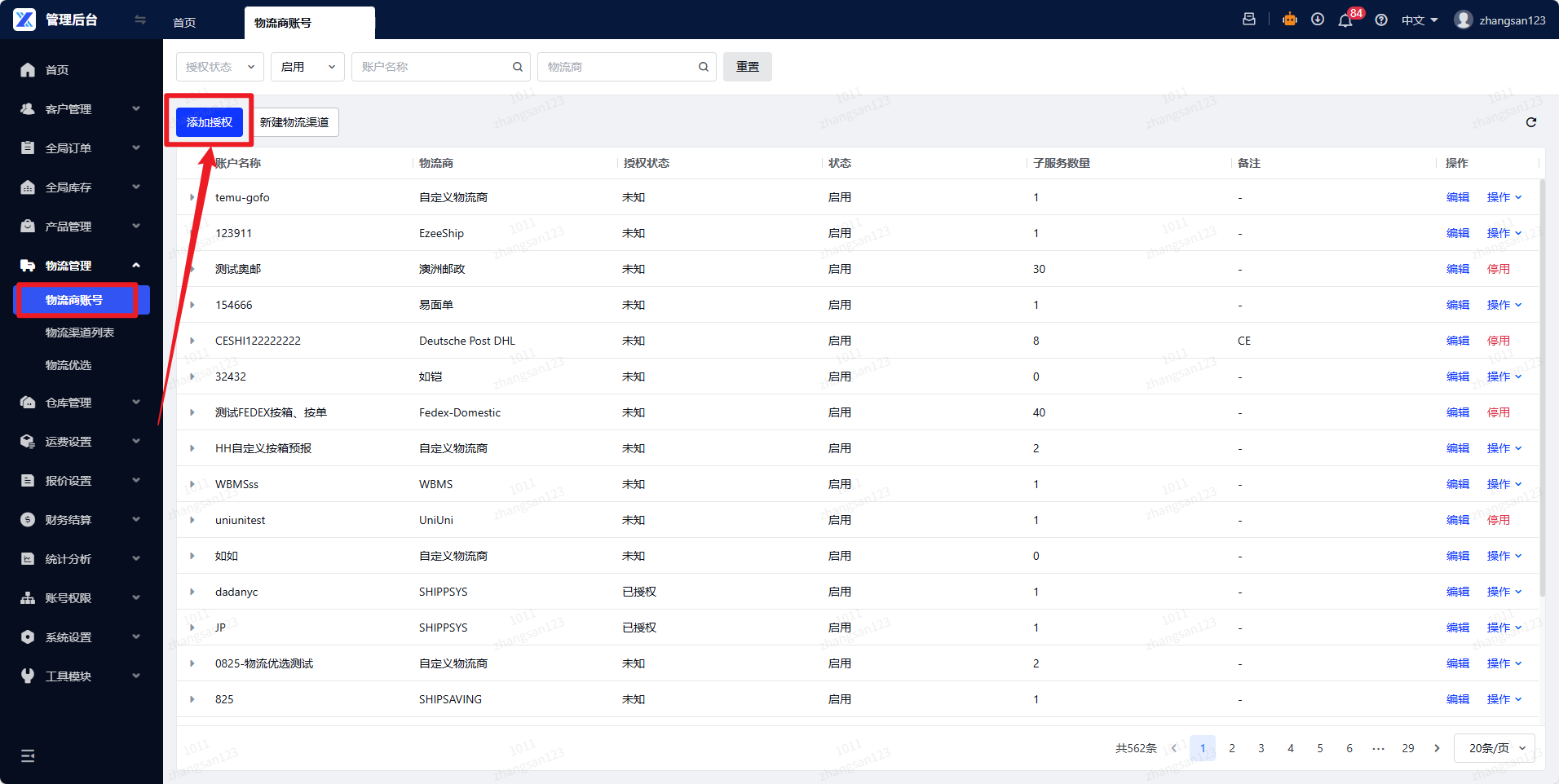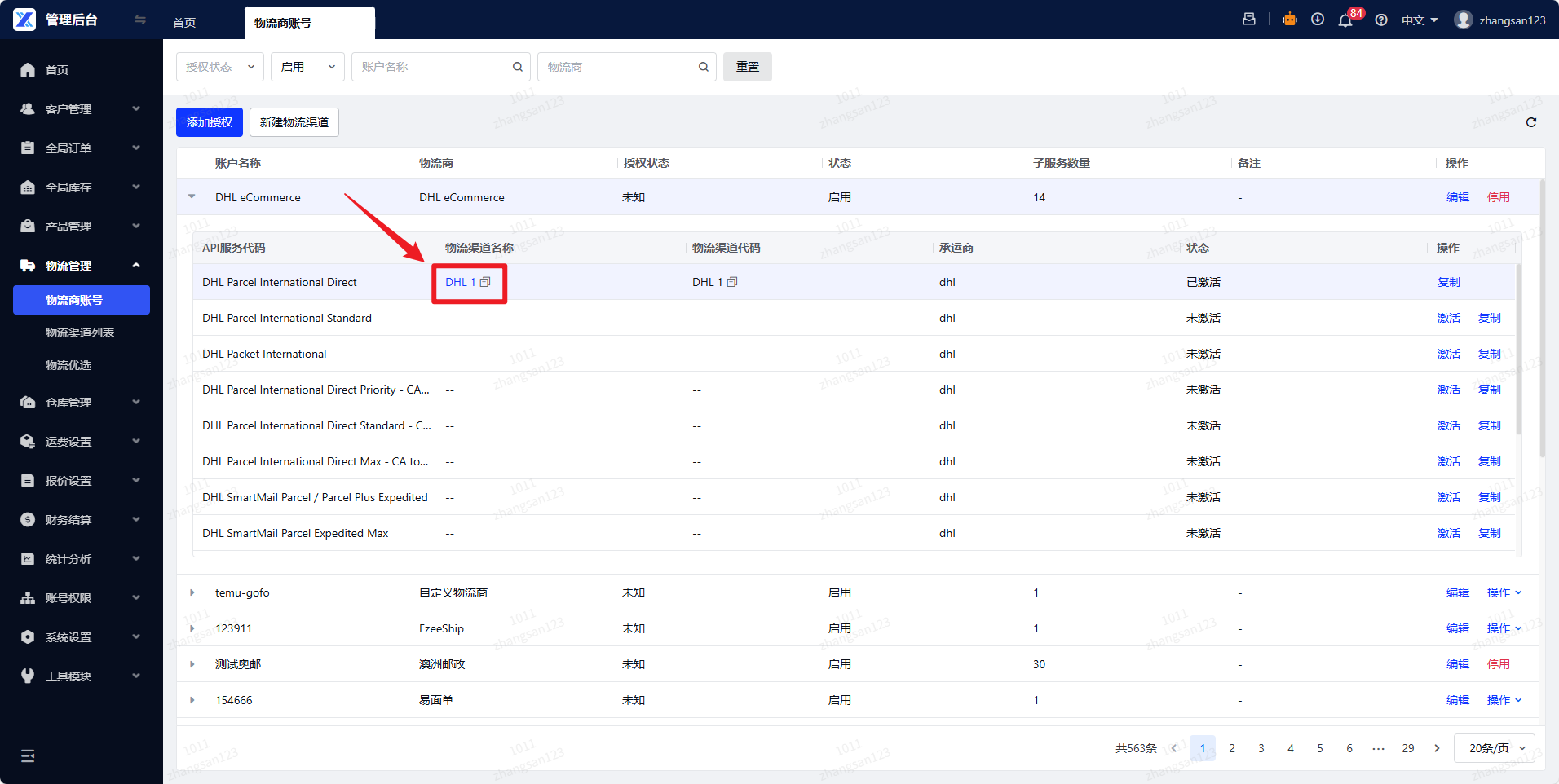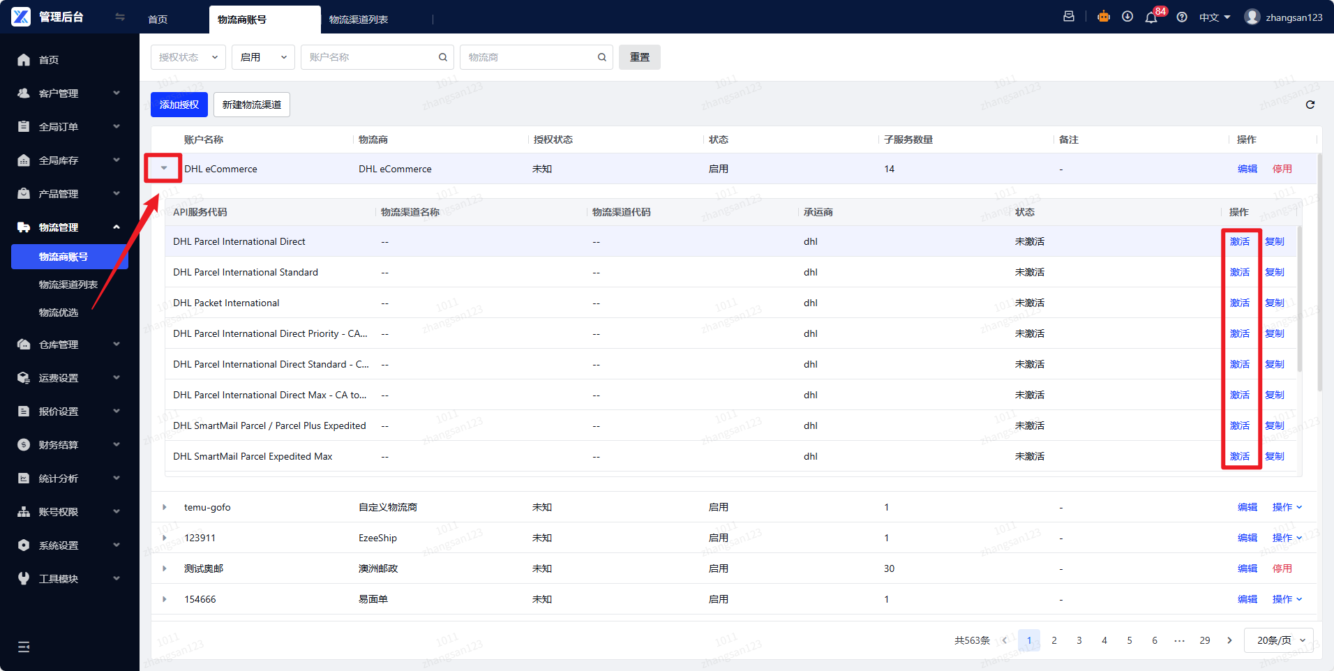 (3)激活物流渠道服务:完成授权后,点击账户名称旁的展开键,在列表中激活需要使用的渠道