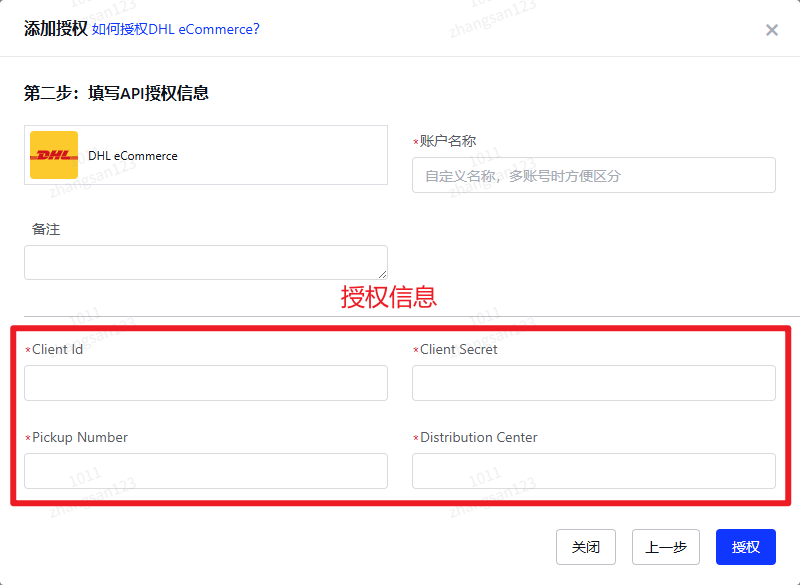- 授权信息包括:Client ID、Client Secret、Pickup Number、Distribution Center