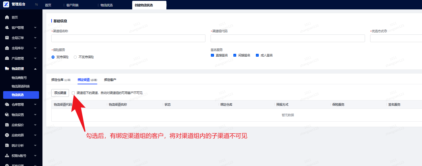 ● 保险服务:为了规避货物在运输、仓储、装卸等物流环节中可能发生的风险而设计的一种金融保障服务。所以设置渠道组的保险服务的时候,需要确保渠道组内的子渠道都是支持改服务的才可以。