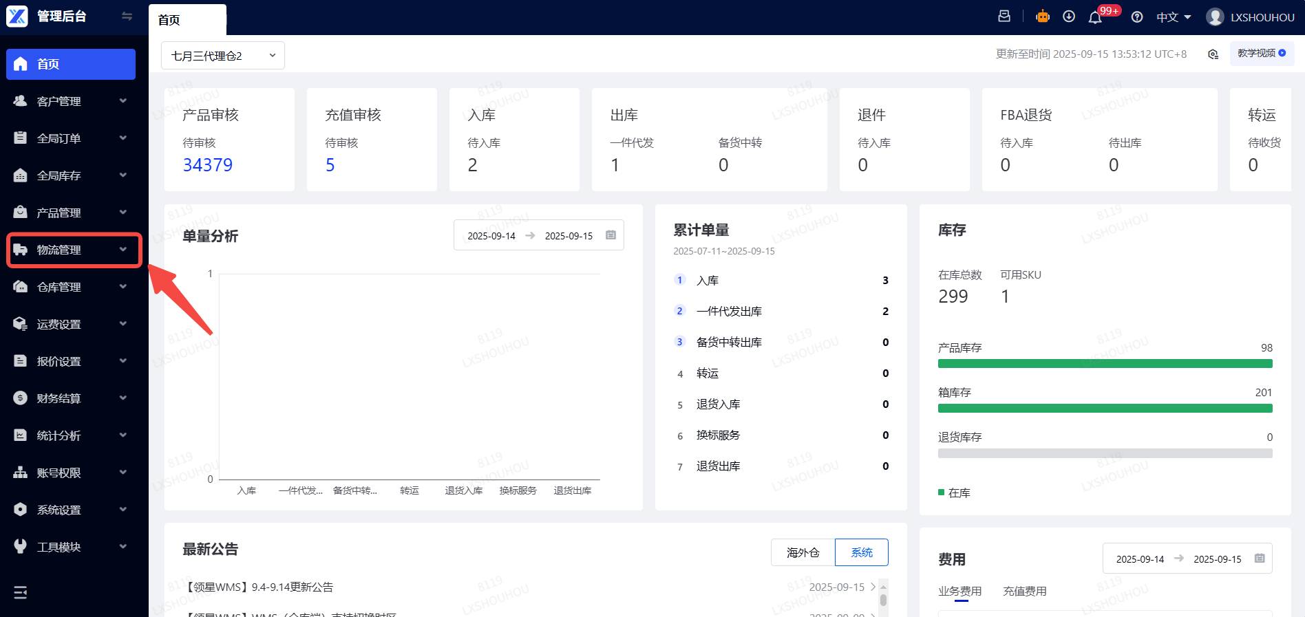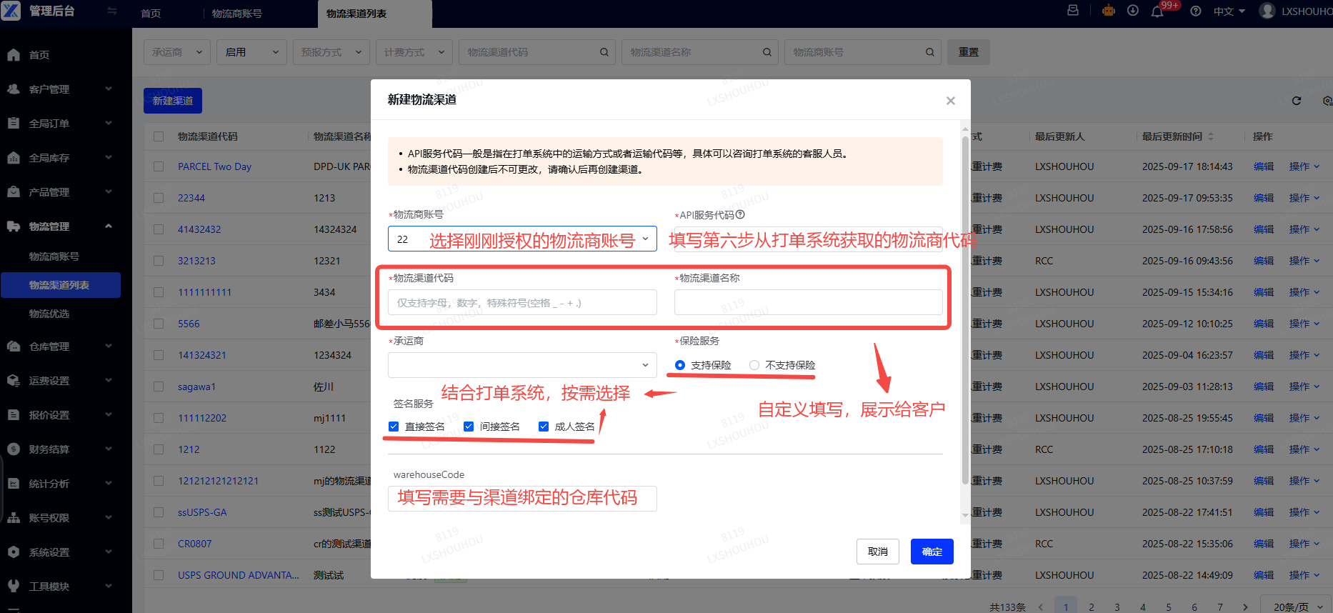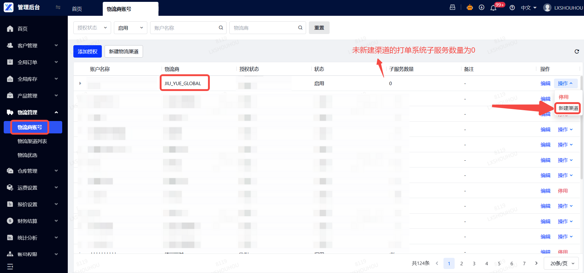 导航至物流管理-物流商账号,找到刚才授权的 JIU_YUE_GLOBAL 物流商,点击新建渠道