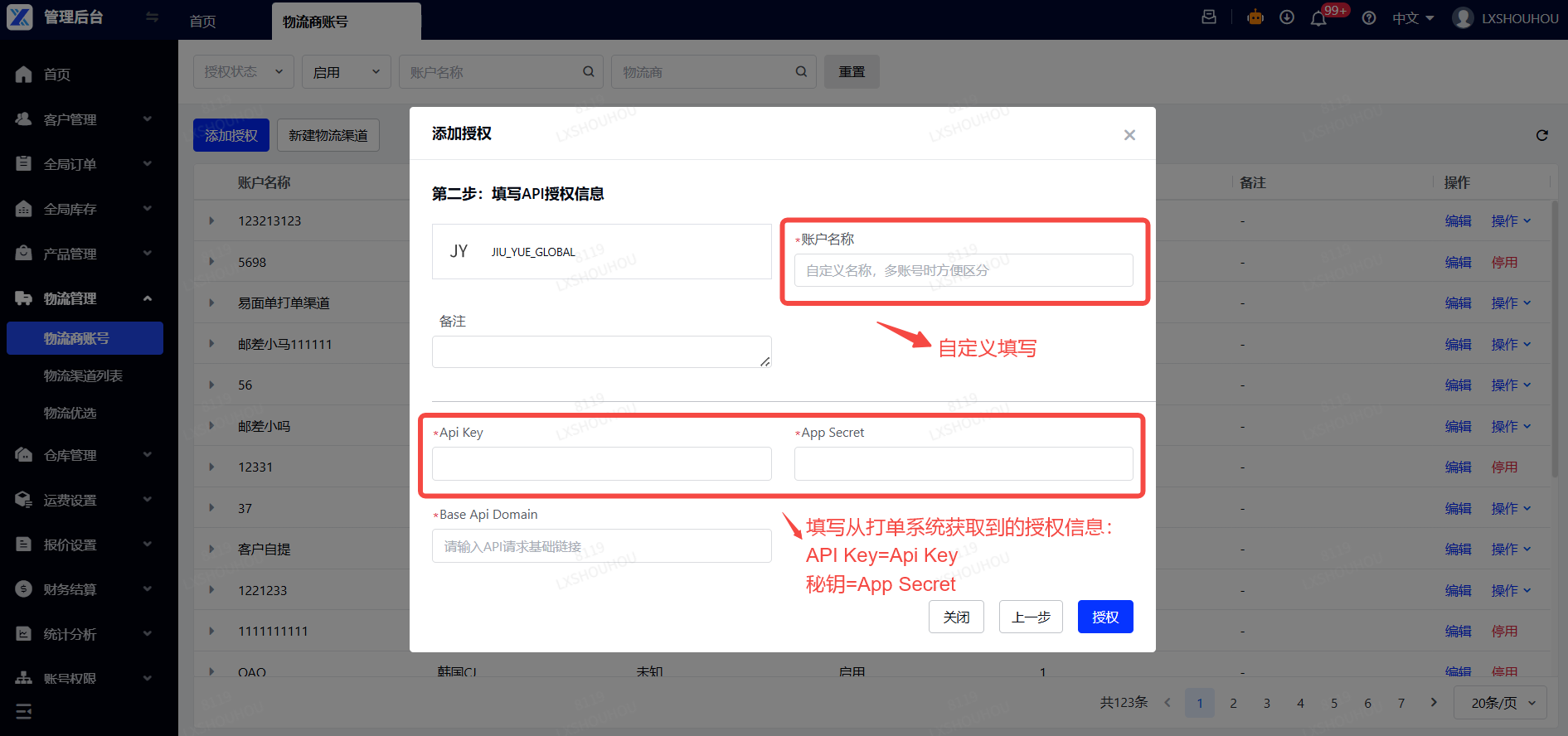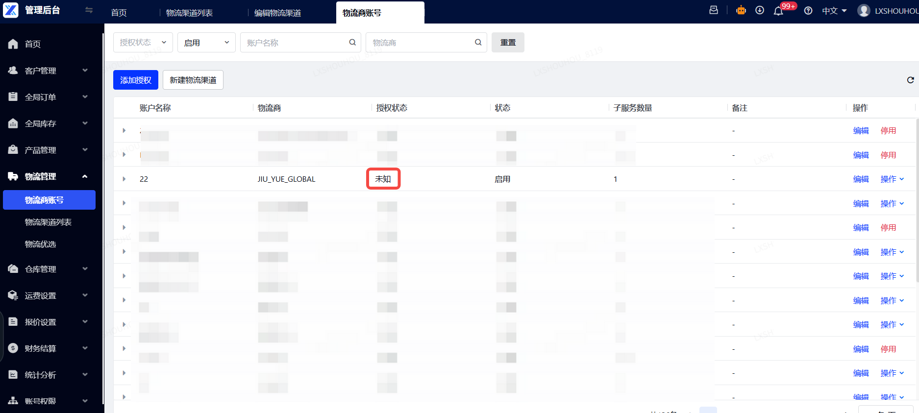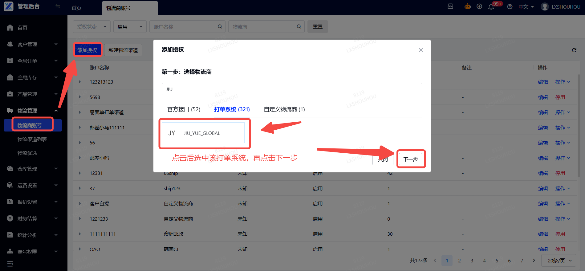 导航至物流管理-物流商账号,点击添加授权,找到JIU_YUE_GLOBAL,点击下一步