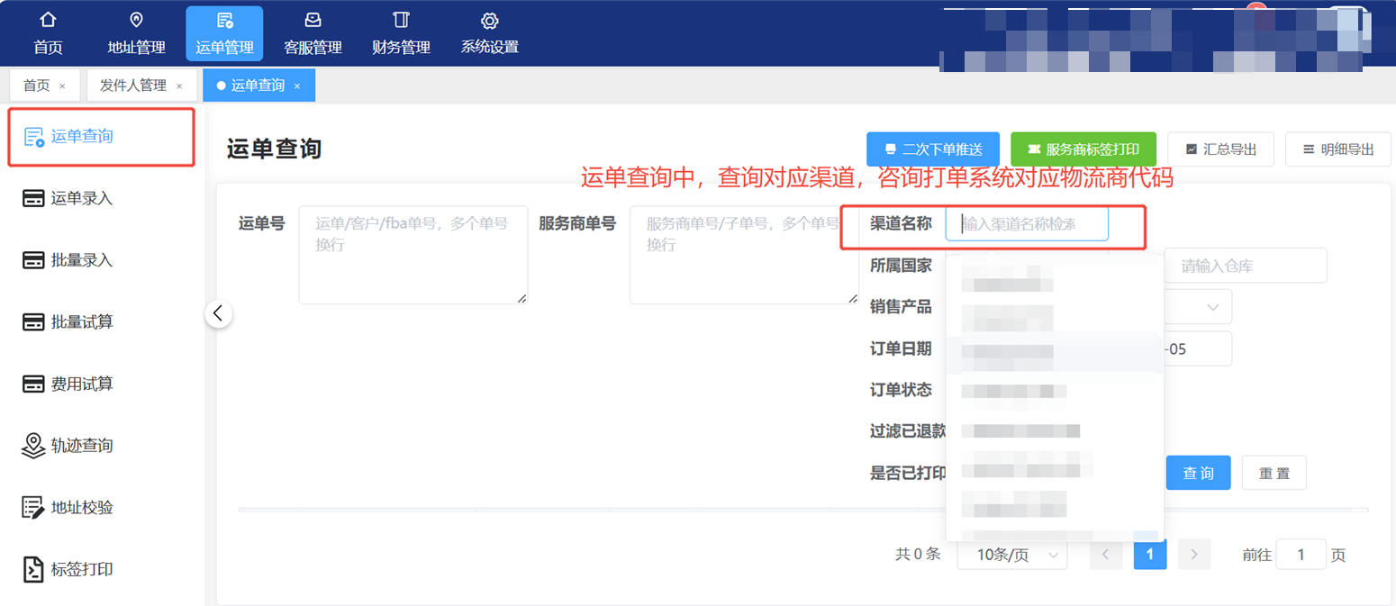 在 JIU_YUE_GLOBAL 系统的运单管理-运单查询界面,搜索查询对应的物流渠道,咨询 JIU_YUE_GLOBAL 的客服获取对应渠道的物流商代码