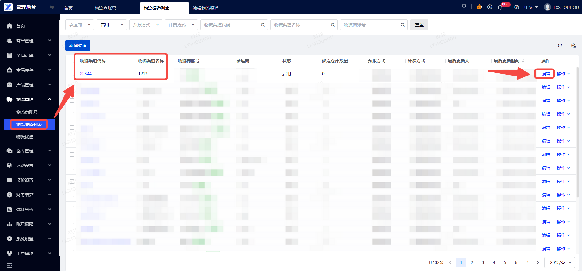 导航至管理后台-物流管理-物流渠道列表,找到刚刚新建的渠道,点击编辑。