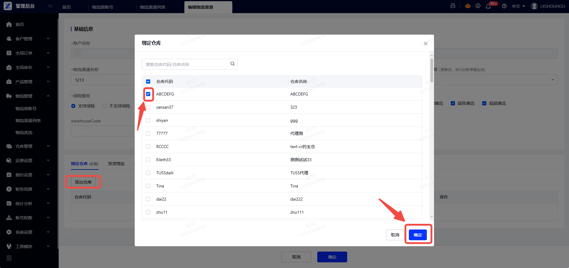 在编辑渠道页面,勾选需要与该渠道进行绑定的仓库,勾选完成后点击“确认”按钮。