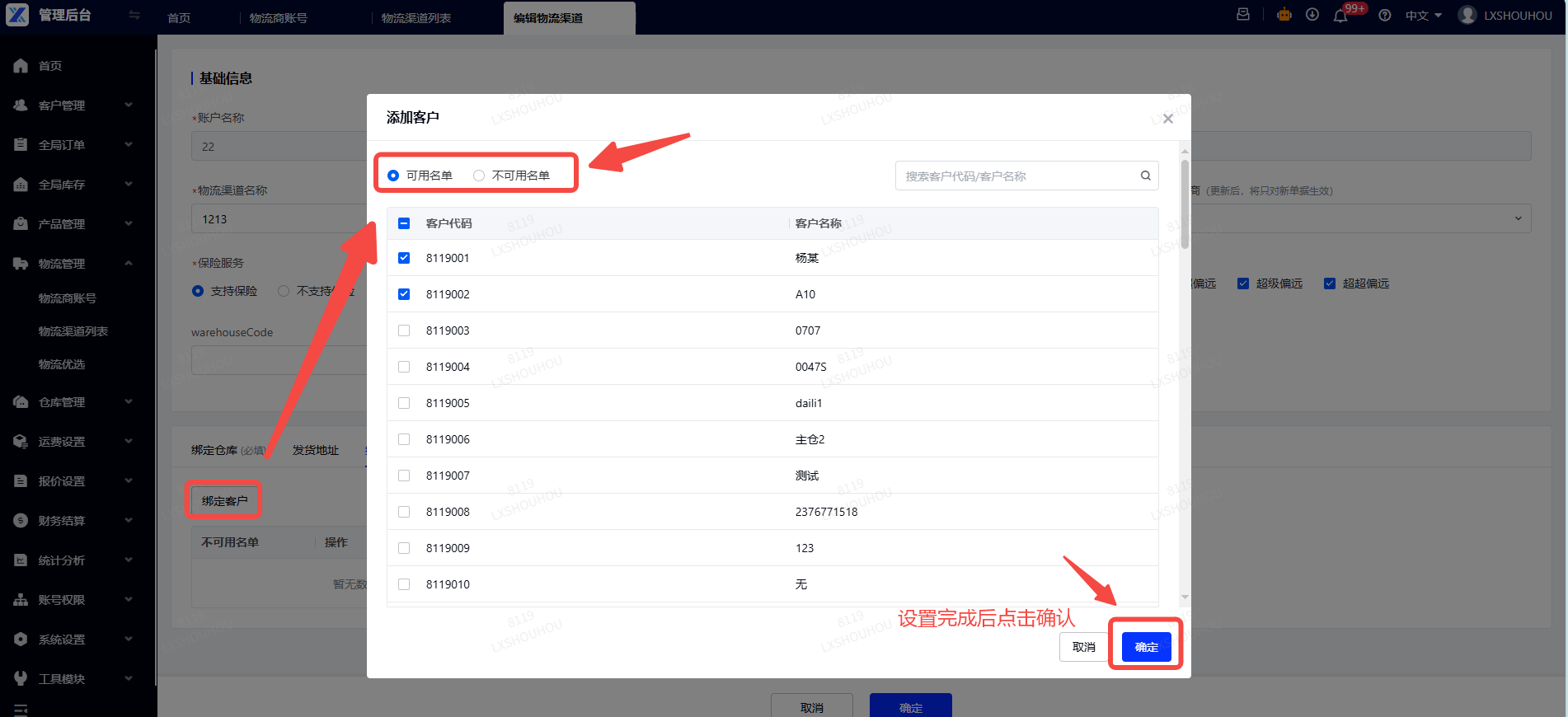 选择 “可用名单” 时,从列表中勾选特定客户,只有被选中的客户能使用当前物流渠道;