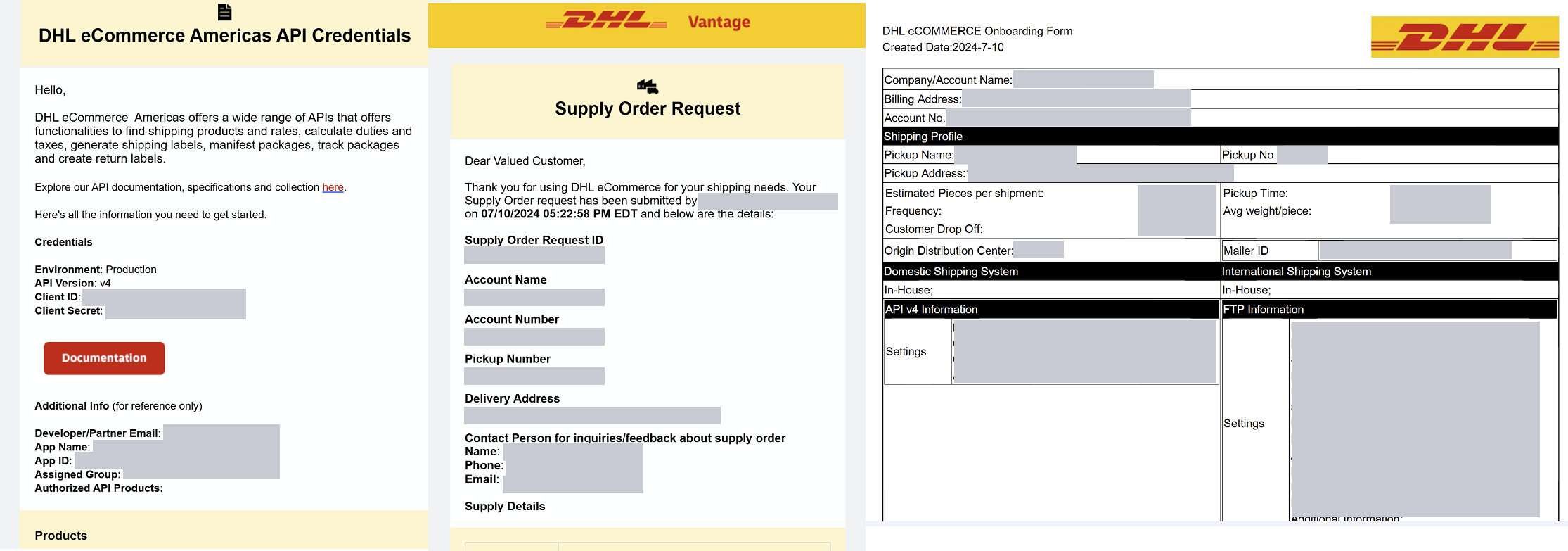 (1)获取API授权信息:访问DHL官网或联系DHL商务人员创建账号并开通DHL eCommerce API权限,开通成功后,DHL会通过邮件给您发送API授权信息。如果您还没有API授权信息,请联系DHL获取