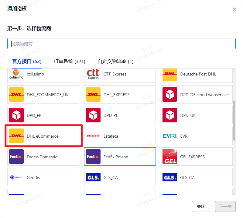 (2)进入OMP管理后台系统进行物流商授权:OMP管理后台-物流管理-物流商账号,点击添加授权,搜索DHL eCommerce,点击下一步,填写上一步从DHL获得的授权信息,账户名称是自定义内容,只是用于多账号的时候做区分