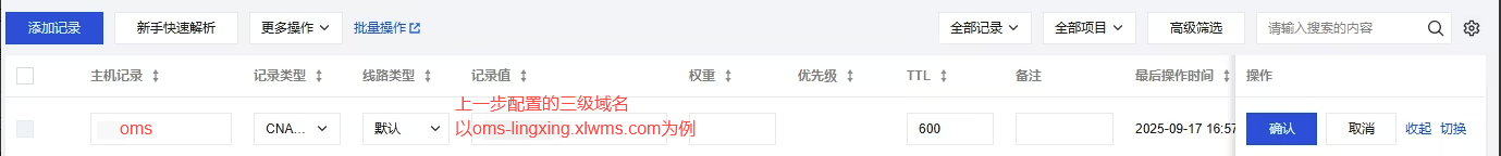 主机记录:至少添加3条,分别填写omp、oms、wms。记录类型:选择 “CNAME”。记录值:填写上一步已配置的三级域名,以oms-lingxing.xlwms.com为例
