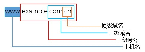 - 域名级别:互联网名称与数字地址分配机构(ICANN)负责管理和协调国际互联网络域名系统。根据ICANN的定义,一个完整的域名至少有两个部分,各部分之间用“.”来分隔,最后一个“.”的右边部分称为顶级域名,也称为一级域名;最后一个“.”的左边部分称为二级域名;二级域名的左边部分称为三级域名,以此类推,每一级的域名控制它下一级域名的分配。下图以www.example.com.cn为例,为您介绍域名的级别。