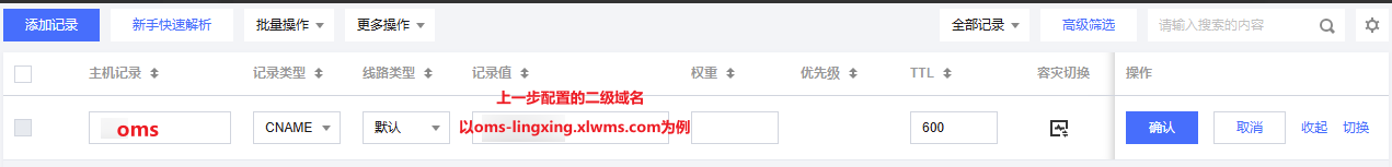 主机记录:至少添加3条,分别填写omp、oms、wms。记录类型:选择 “CNAME”。记录值:填写上一步已配置的二级域名,以oms-lingxing.xlwms.com为例