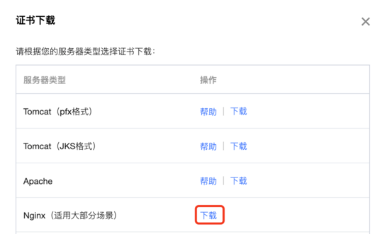 - CA 机构认证审核通过后,将会正式颁发证书。请在 SSL 证书控制台 中选择您需要安装的证书并单击下载。在弹出的 “证书下载” 窗口中,服务器类型选择Nginx,单击下载。无需解压,请将压缩包源文件提供领星WMS客服;