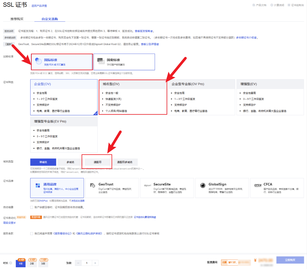 登录 SSL 证书购买页。请务必选择国际标准 - 域名型(DV) - 通配符