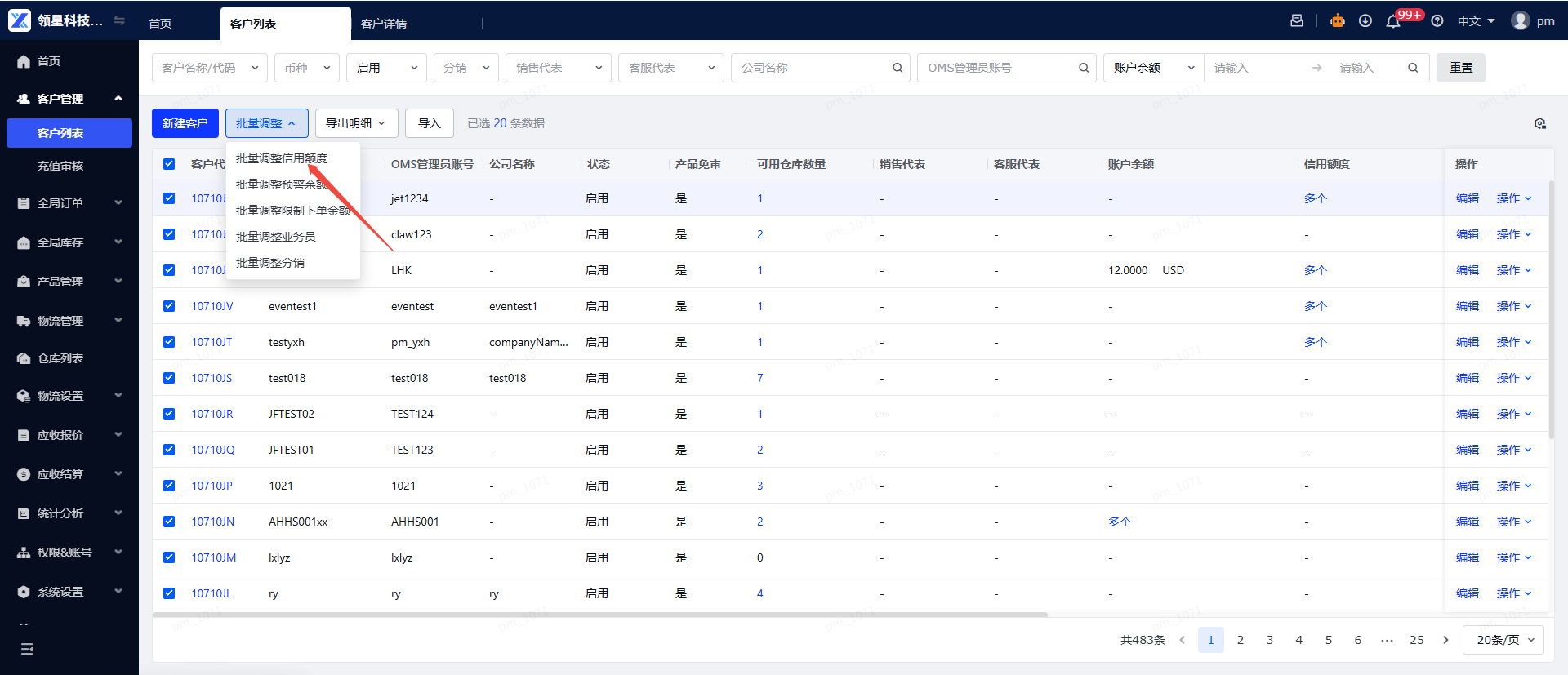 操作路径:【客户列表】→ 勾选多个客户 →【批量调整信用额度】