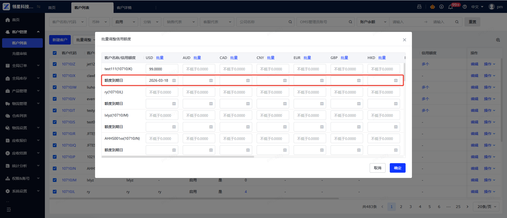 定义:额度到期日是针对客户信用额度新增的有效期配置项。仓库可按照"客户+币种"的维度,为每笔信用额度设置到期日。到期日当天24:00,对应币种的信用额度将自动清零,无需人工操作。