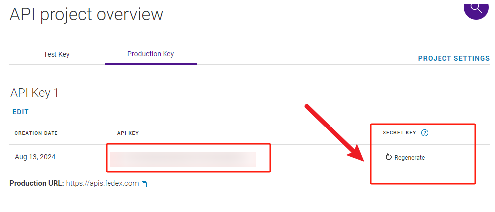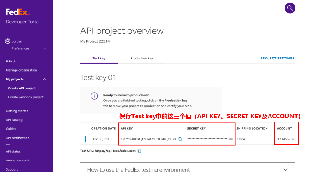 - FedEx Production Authentication Key需填写Prodution Key界面的API KEY信息。