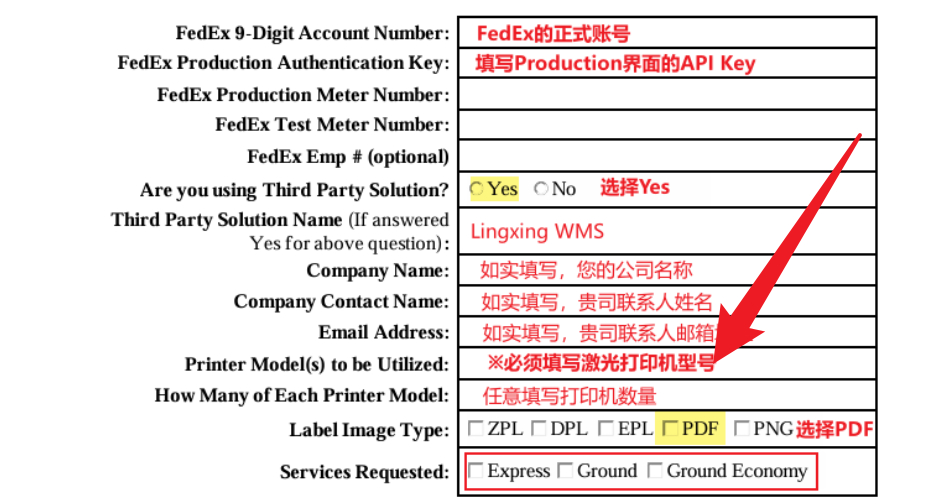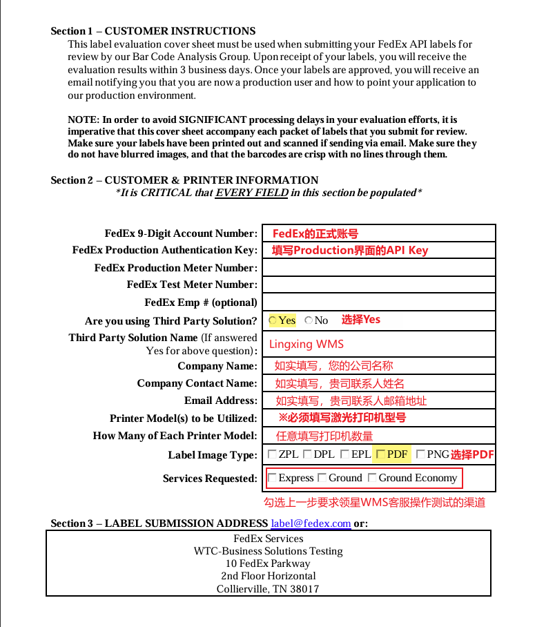 (2)打印面单并扫描成PDF文件领星WMS客服完成测试后,会提供面单文件链接,您可以点击链接自行下载或操作打印。为确保面单的清晰度,建议使用热敏打印机操作打印,并将面单贴在A4纸上,再扫描成PDF文件。(请不要直接扫描原面单,会被FedEx判定为使用热敏打印机,且必须提供ZPL文件。增加不必要的困难)系统目前仅对接了FedEx的PDF接口,无法获取ZPL类型文件。(3)填写托运API认证表点击下方网址,获取托运api认证表单,填写并保存为pdf :https://developer.fedex.com/api/content/dam/fedex-com/irc/common/Label-Cover-Sheet-form.pdf请参考下图示例填写: