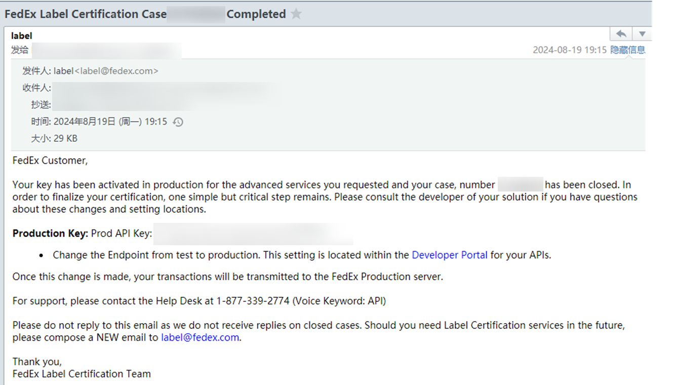 (4)在生产环境启用Production KeyFedEx审核通过后,会通过邮件形式通知您将Prod API Key从测试环境转至生产环境。返回FedEx Developer Portal - Production Key界面,点击Regenerate,生成SECRET KEY。