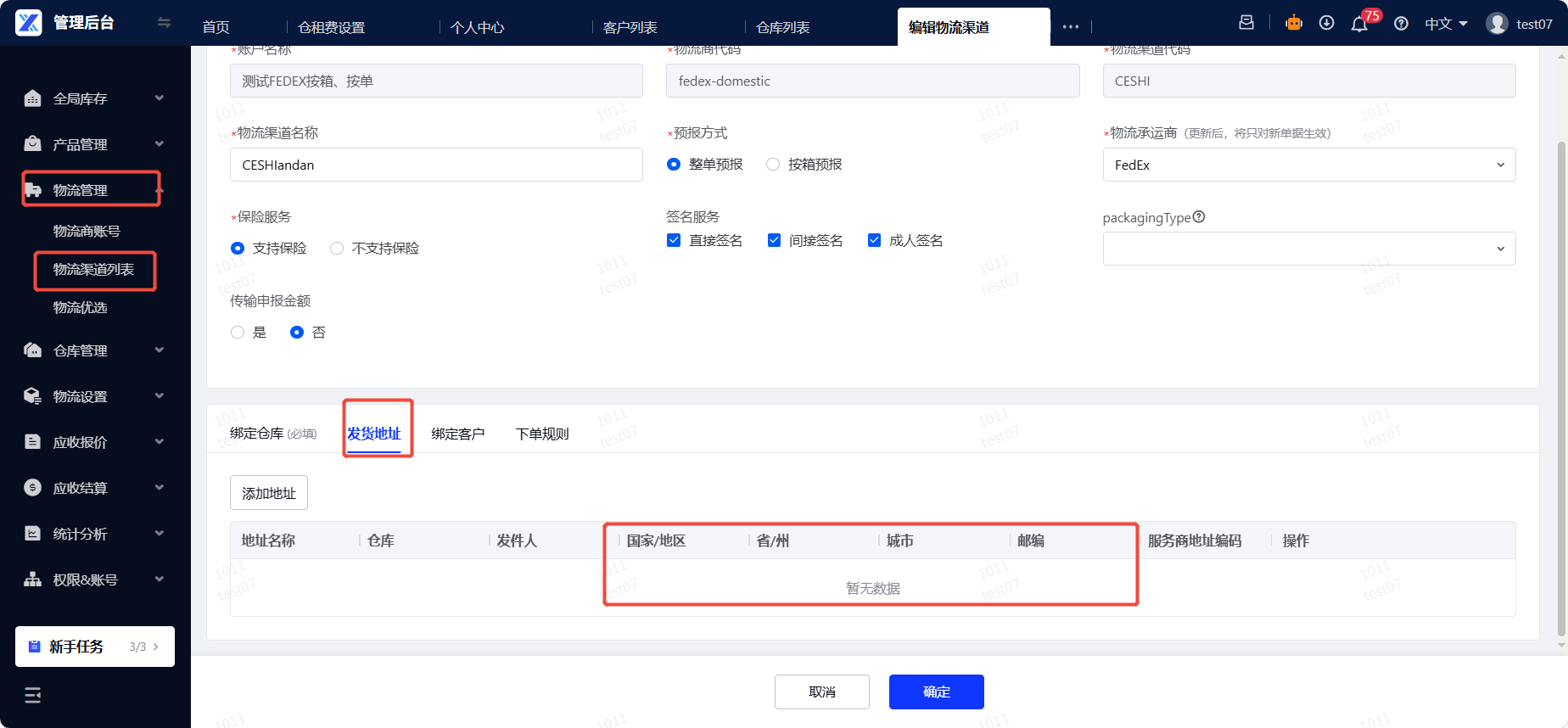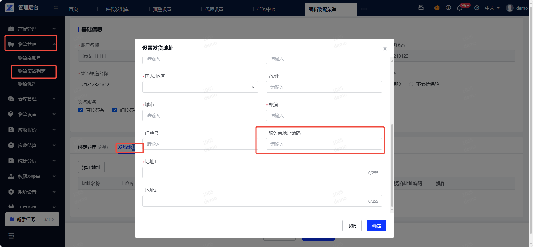 出现该报错,一般是打单系统需要维护地址信息,需要获取打单系统中服务商地址编码填入OMP-物流渠道列表-编辑-发货渠道-服务商地址编码中。