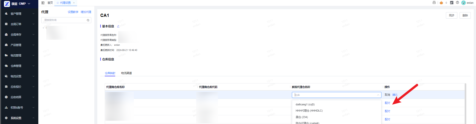 【仓库映射】首次授权后请等待仓库信息同步,点击配对,选择领星OMP已创建的代理仓,并点击确认。将两个系统的仓库进行绑定。