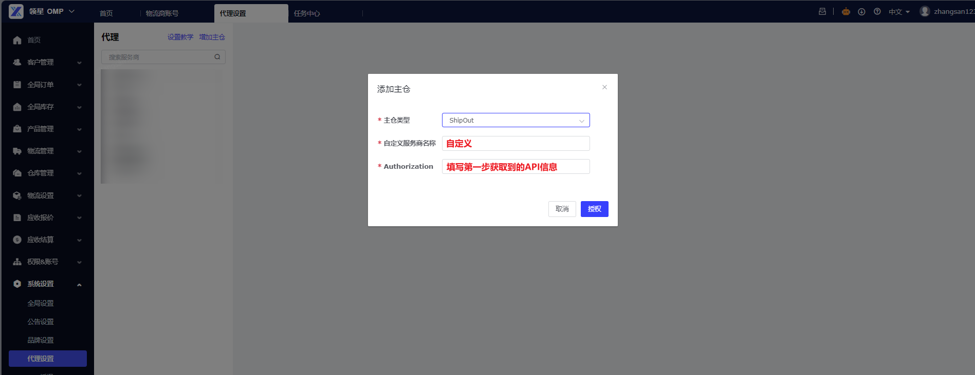 【路径】:领星OMP - 系统设置 - 代理设置 - 增加代理 - 选择“ShipOut”【注意事项】:1. 自定义服务商名称仅在当前界面显示,OMS客户端无法查看;2. Authorization对应第一步ShipOut的Api密钥,请确保前后没有输入空格;