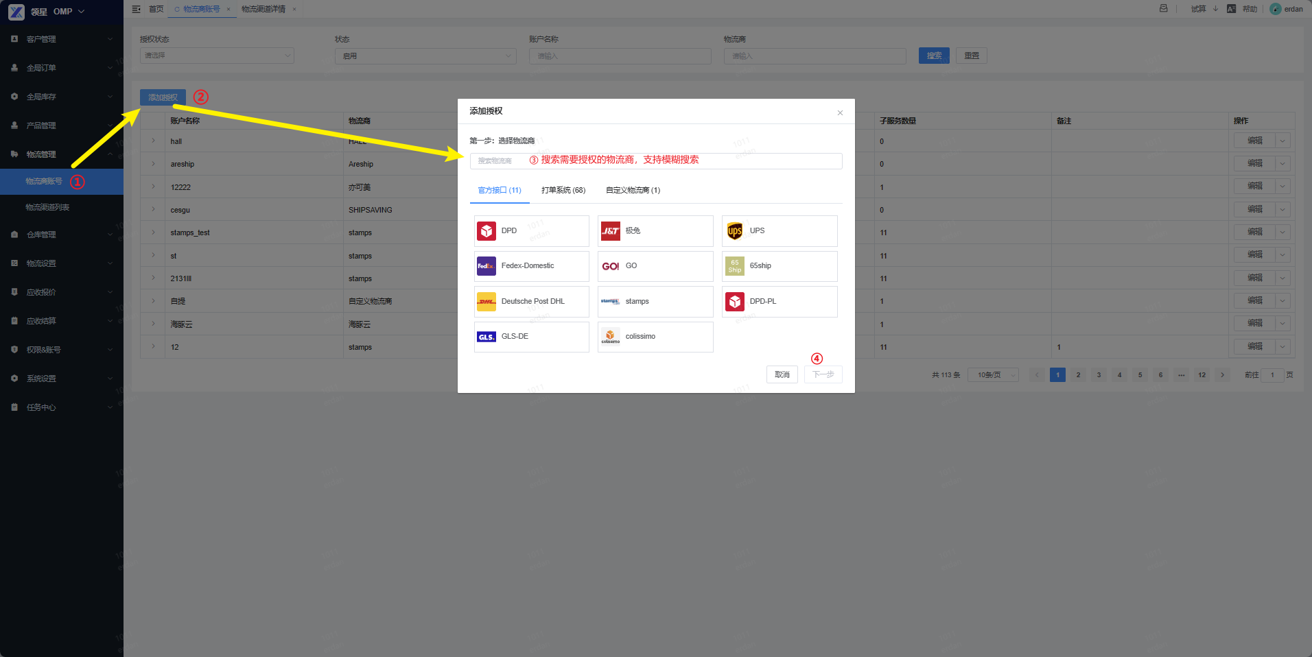 【路径】:领星OMP - 物流管理 - 物流商账号 - 添加授权【注意事项】:1. 如果面单在领星OMS获取推送到主仓,则需要在领星OMP授权打单系统账号并新建物流渠道;2. 如果面单在ShipOut获取,则需要在领星OMP授权自定义物流商并新建物流渠道;3. 物流商授权可参考如何在领星OMP授权物流商 | 领星WMS帮助中心