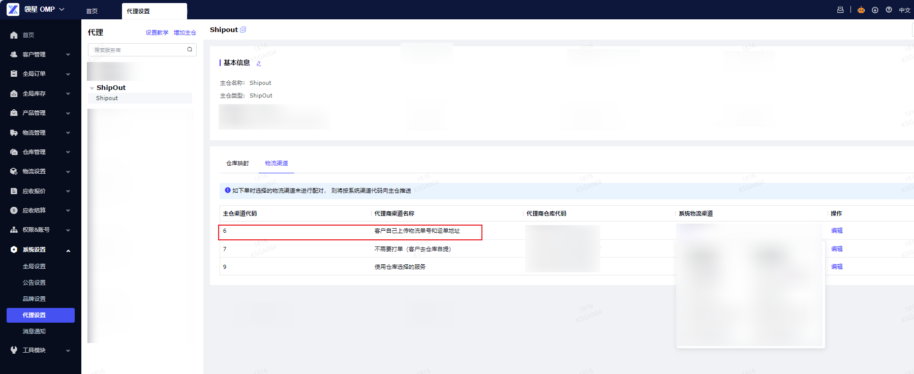 【物流渠道】点击编辑,选择对应的物流渠道,支持ShipOut的一个渠道绑定领星OMS的多个物流。请注意:如果需要将领星获取到的面单推送至ShipOut,请务必将该物流渠道在代理设置中,和主仓渠道代码为【6】的渠道进行配对,未配对的渠道推单时将会报错。
