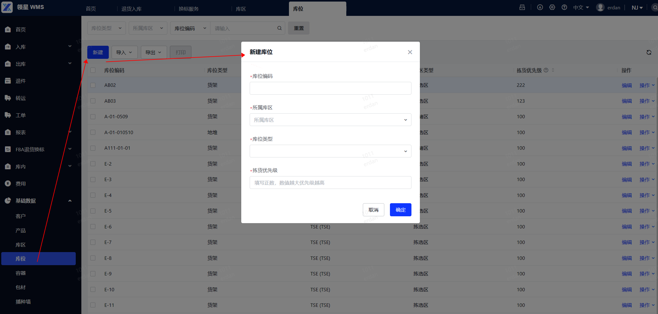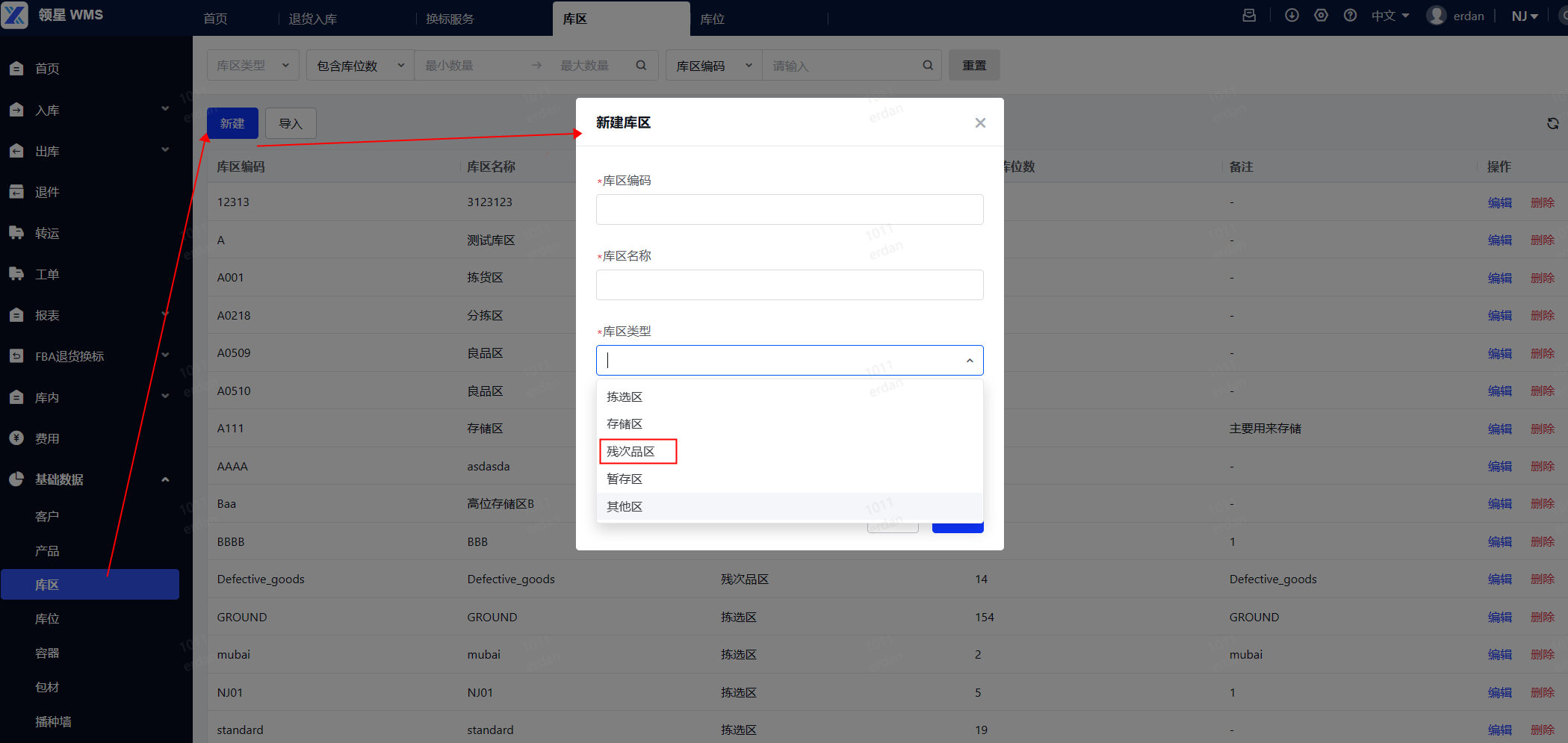 【路径】:领星WMS - 基础数据 - 库区 ----> 库位不需要与海外仓仓保持一致,仅需创建残次品区/正品区各一个。先创建库区再对应创建库位