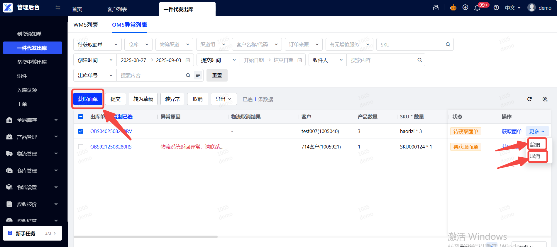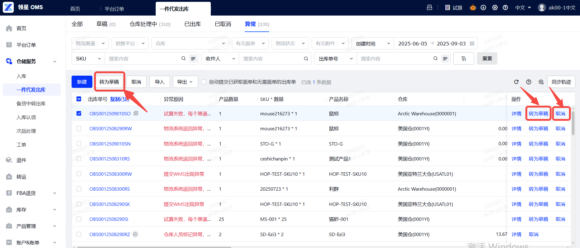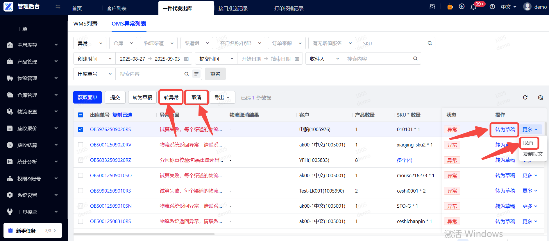 可操作转异常:勾选订单后转异常,订单在OMS端会流转到异常状态,客户可以转草稿后重新在OMS下单或者取消订单。