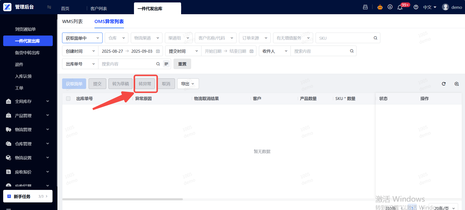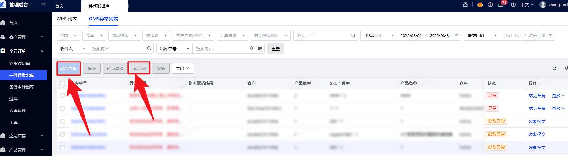 定义:当OMS端出现打单系统报错等异常场景时,可在OMP管理后台-全局订单-一件代发出库-OMS异常列表中查看异常订单情况。