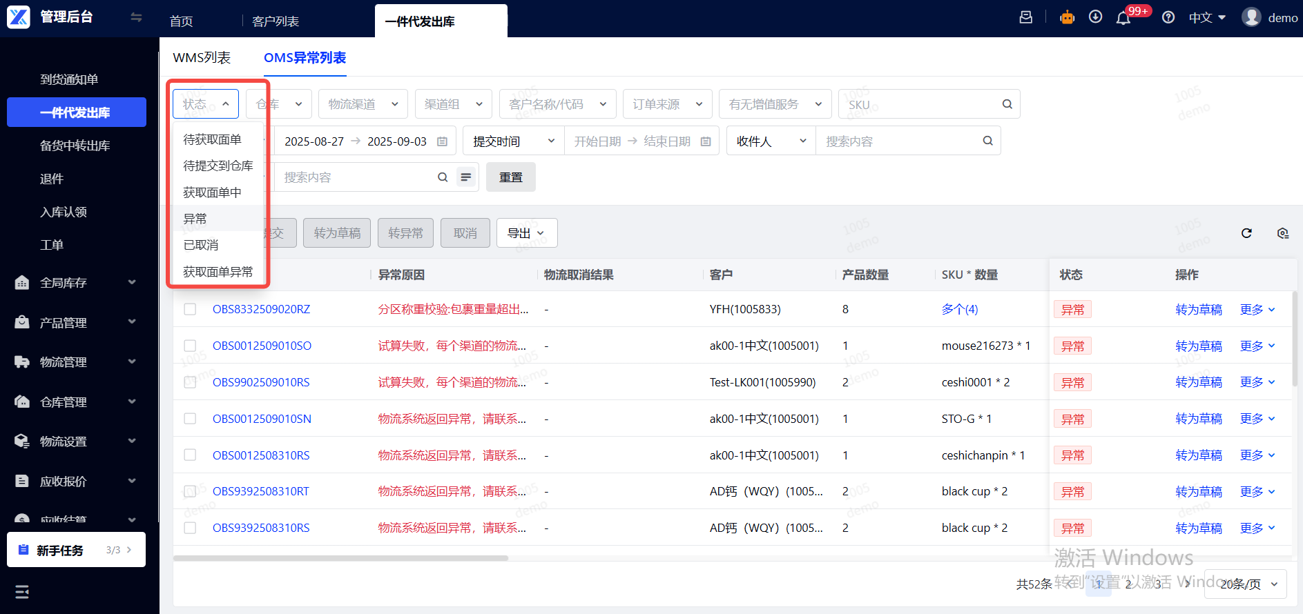 管理后台-全局订单-一件代发出库-OMS异常列表会展示如下状态的订单: