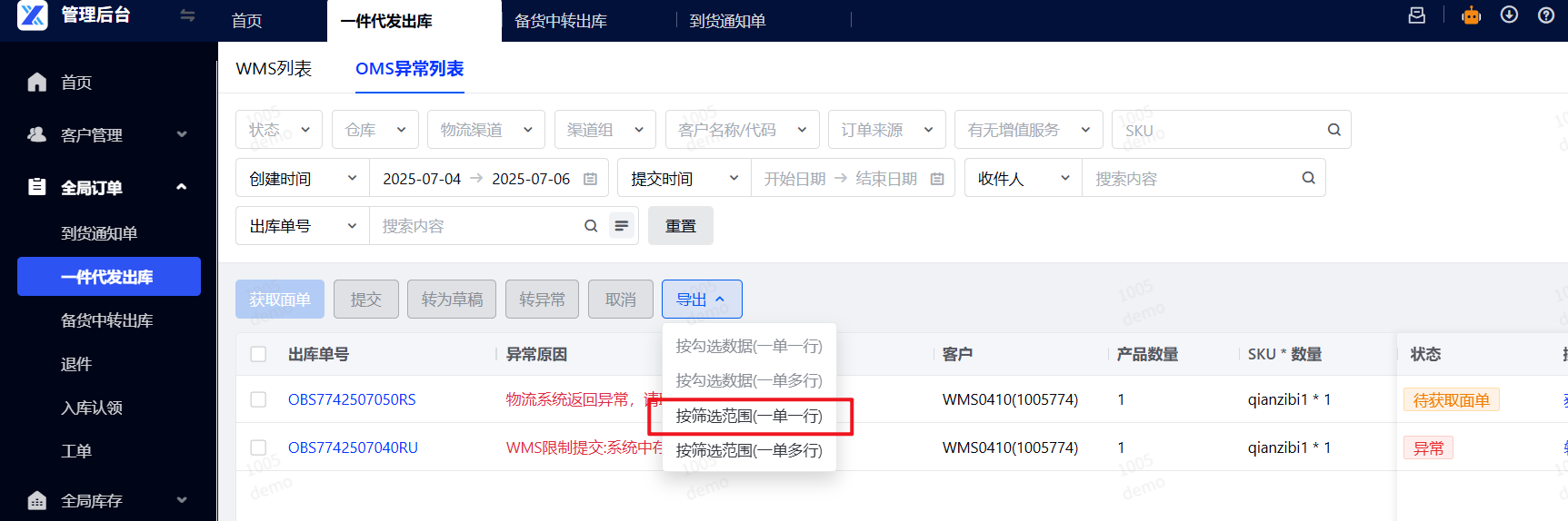 Q4:全局订单-一件代发出库的OMS异常列表目前显示OMS出库单的草稿状态,为什么按照筛选范围导出表格不显示草稿状态的订单?