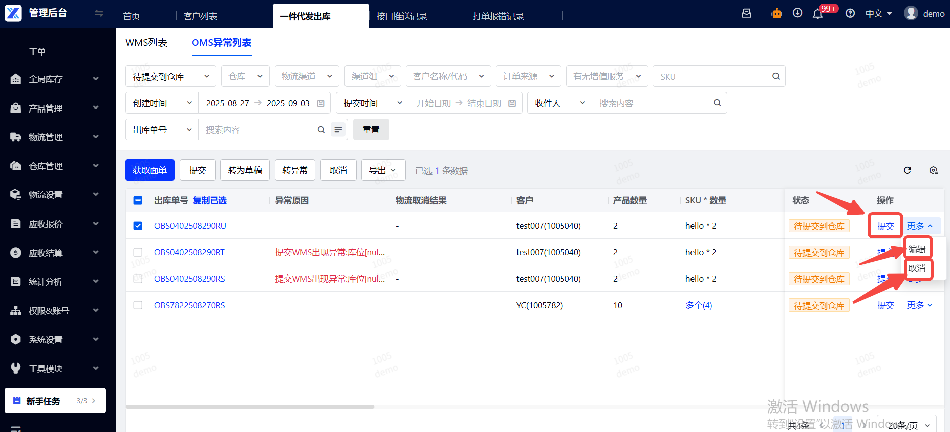可操作提交:提交订单到仓库,提交成功后在OMS端状态会流转为仓库处理中。