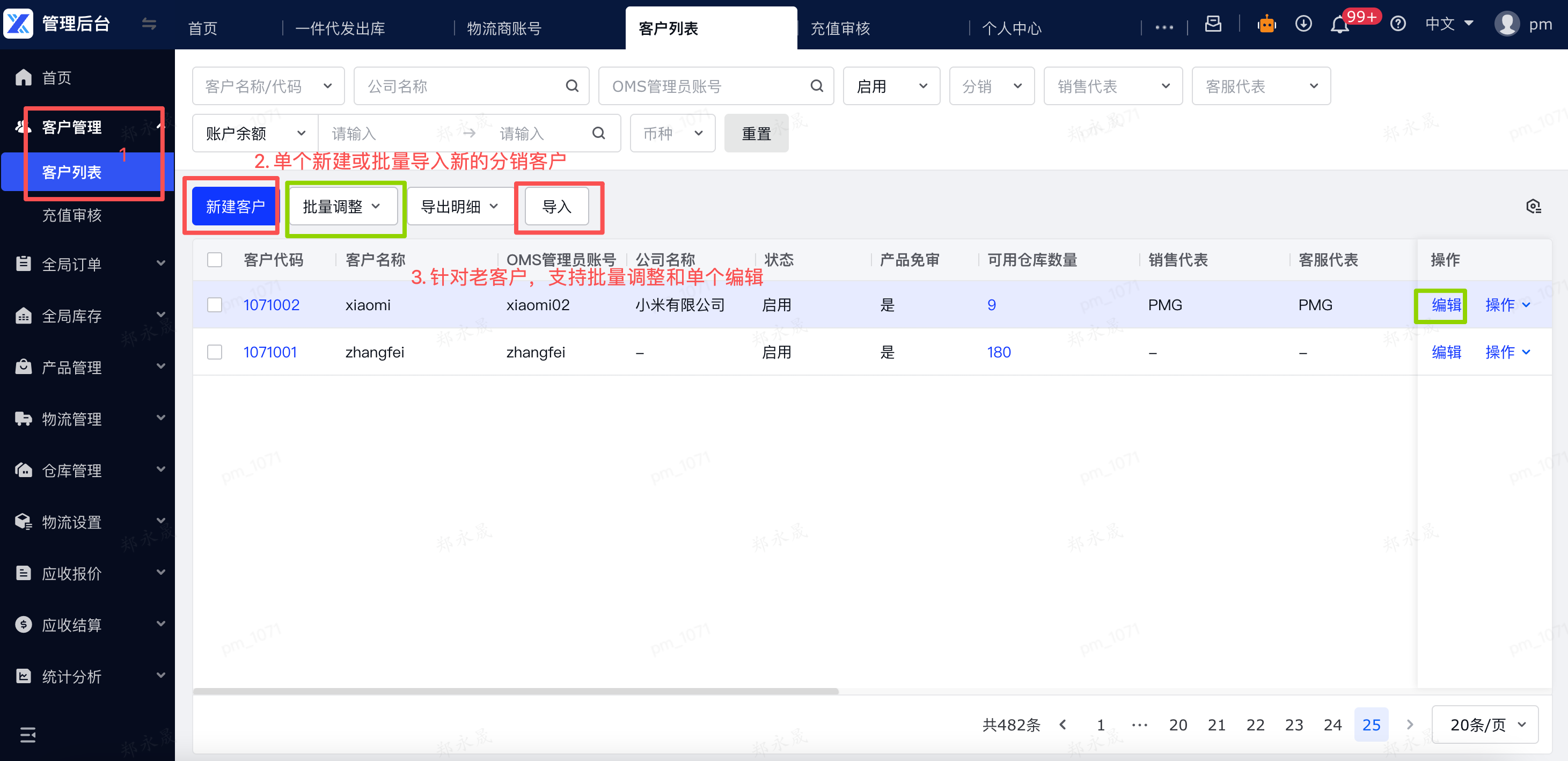 管理后台 - 客户管理 - 客户列表页,支持批量调整分销、单个编辑、导入新建分销客户等方式,为客户设置分销权限