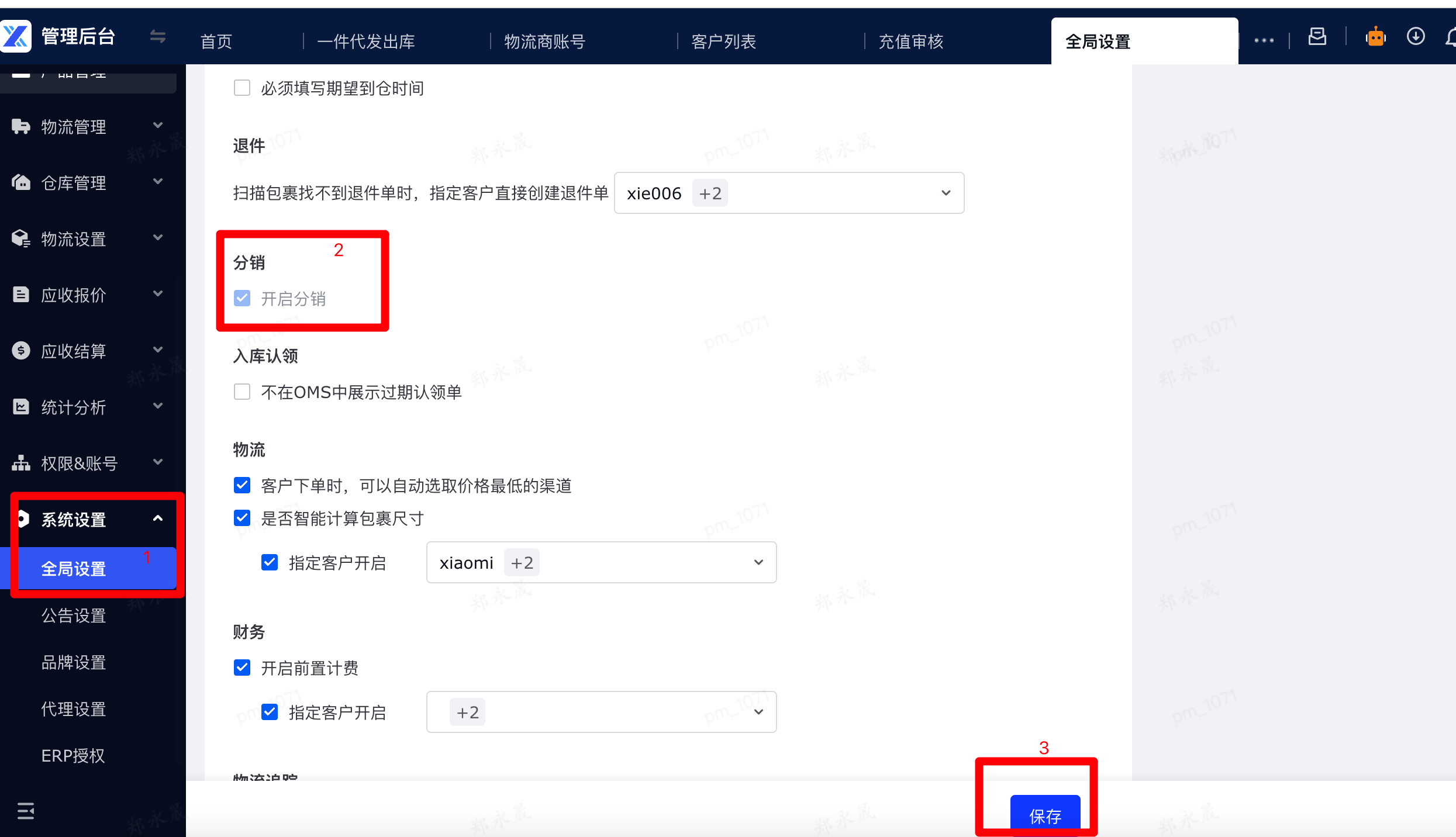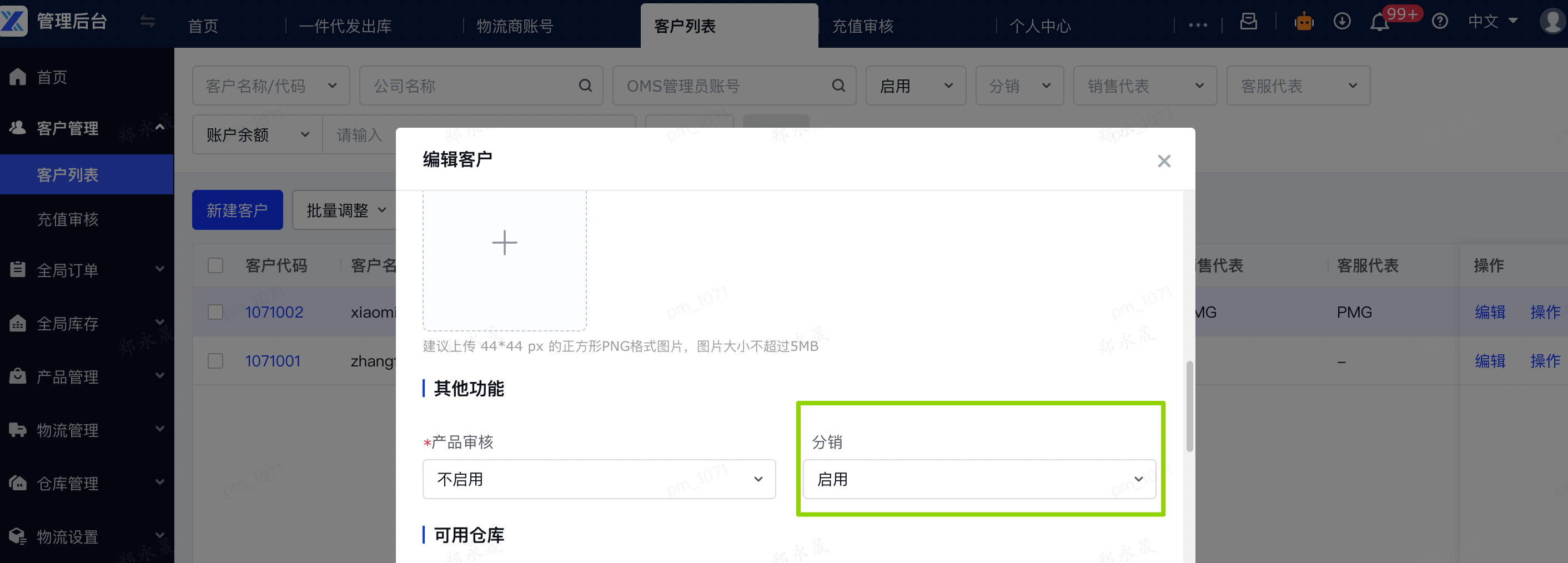 1、管理后台端,设置支持分销的客户