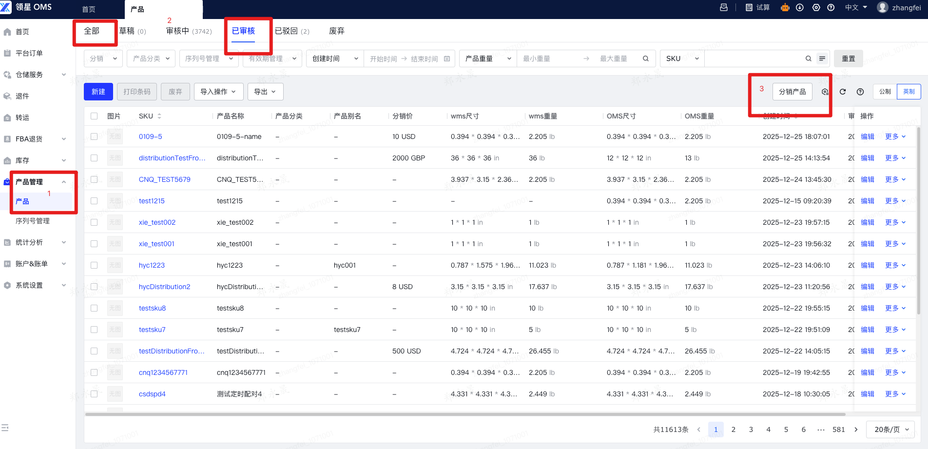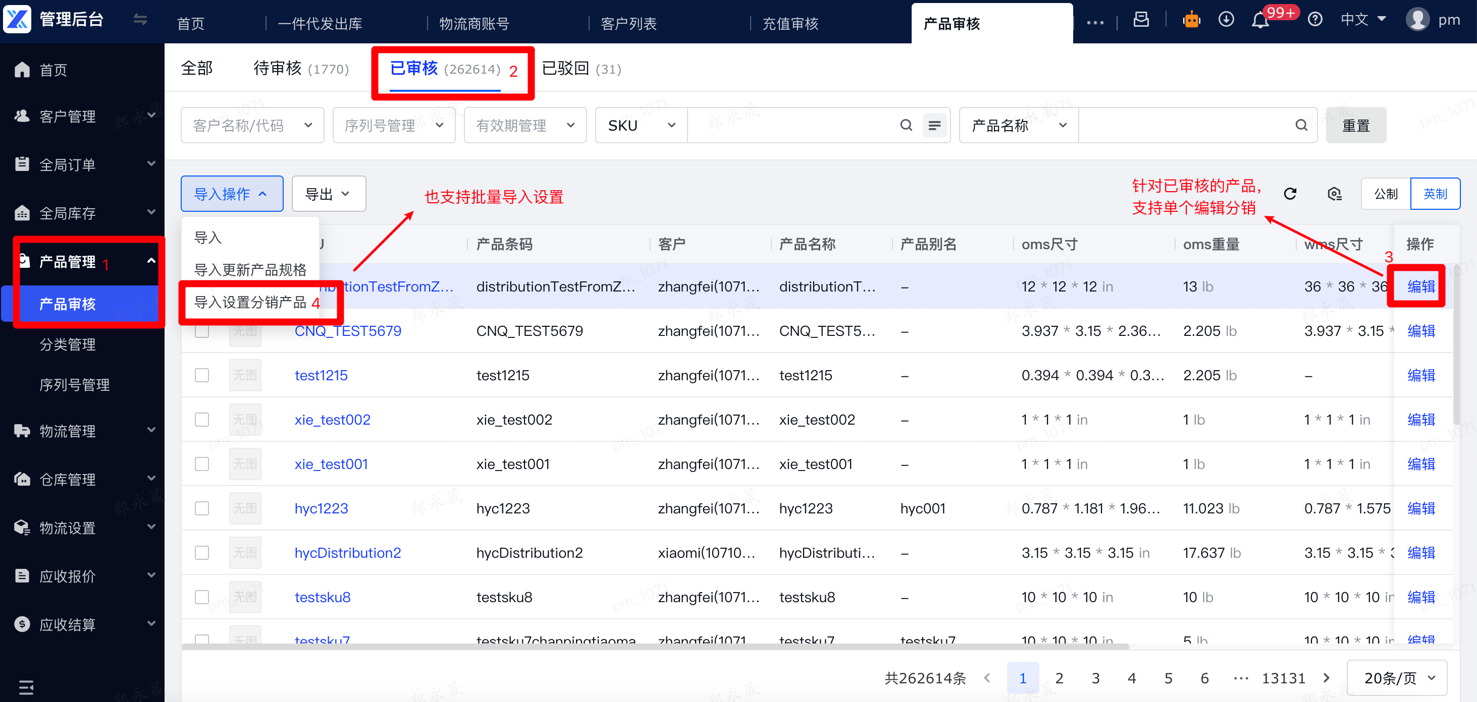 管理后台-产品管理-产品审核-已审核页,给已审核产品设置是否支持分销,也支持导入批量更新。支持分销的产品,即可被分销商在OMS中认领下单