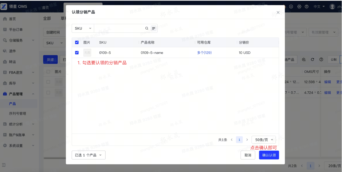 【分销产品】弹窗中,会展示支持认领的分销产品,点击确认认领即可