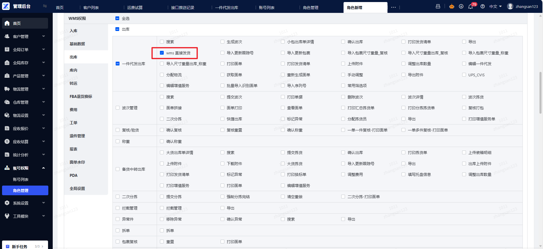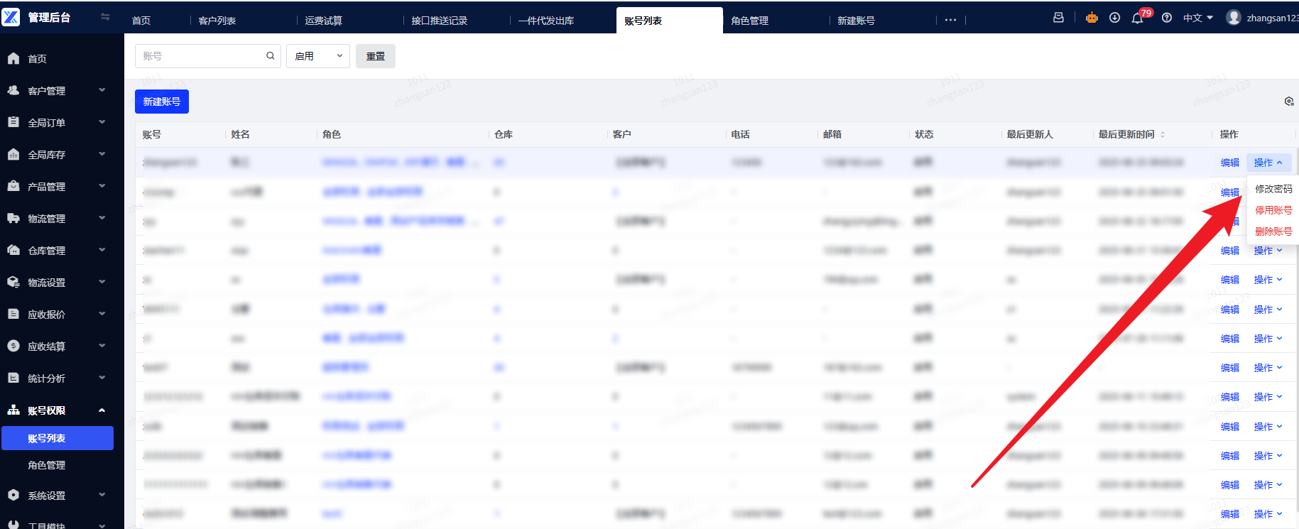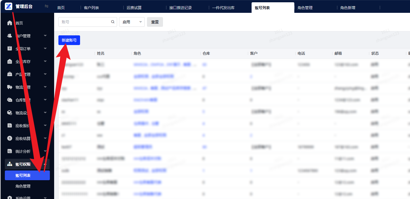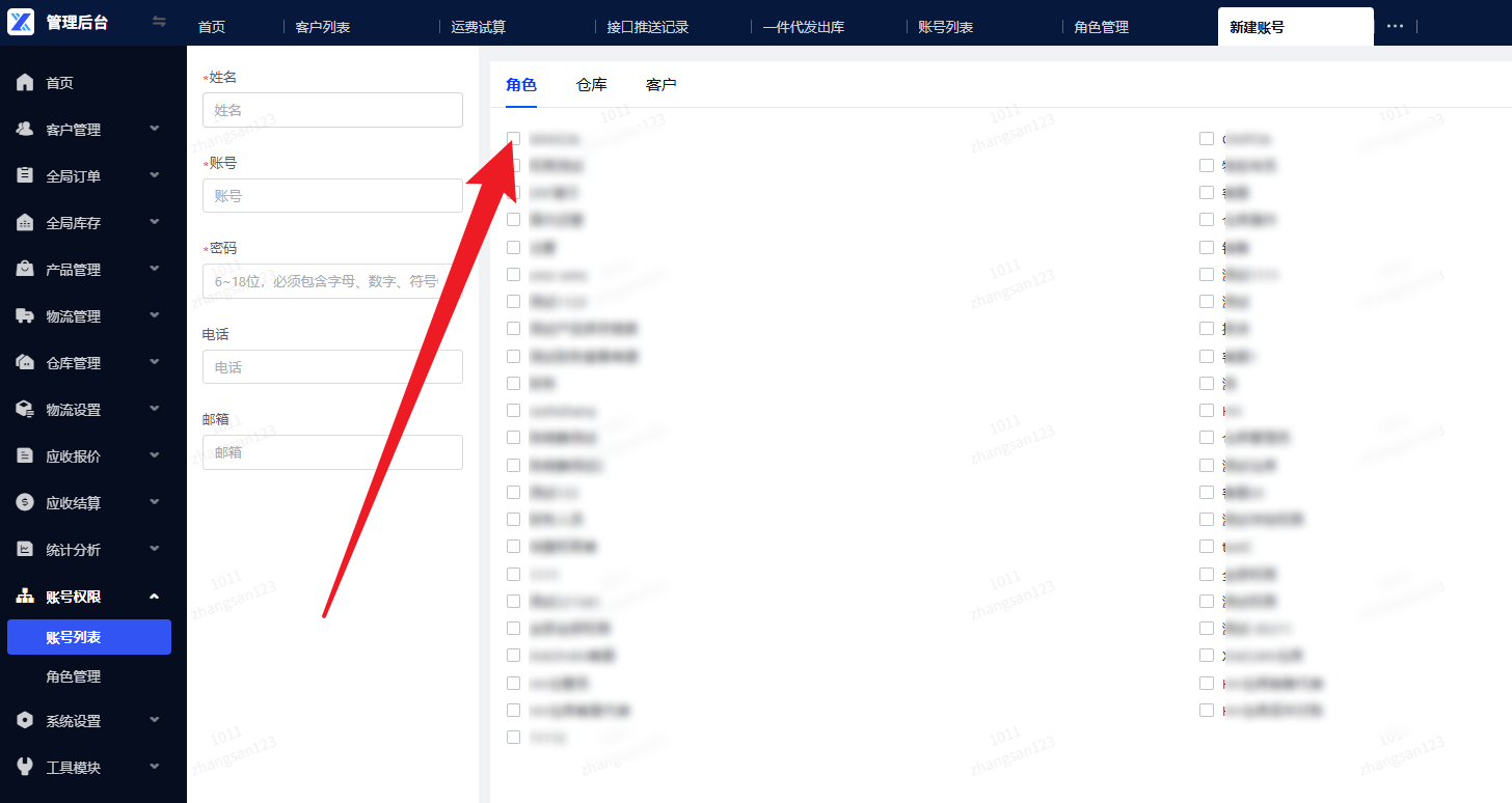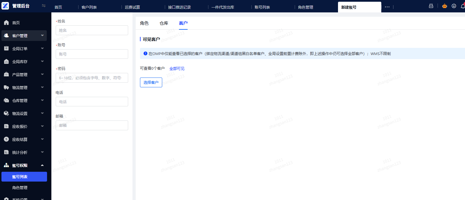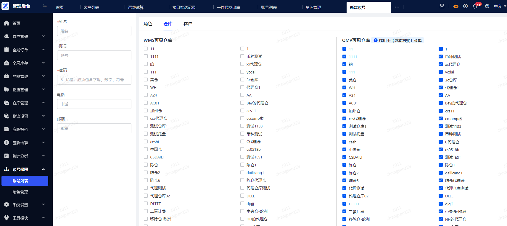 绑定角色权限(2)新建账号新建账号时除填写姓名、账号、密码、邮箱等字段外,还需勾选角色、仓库、客户: