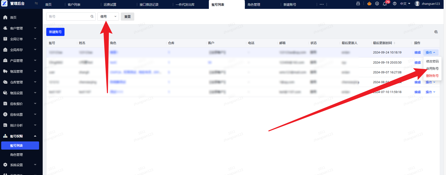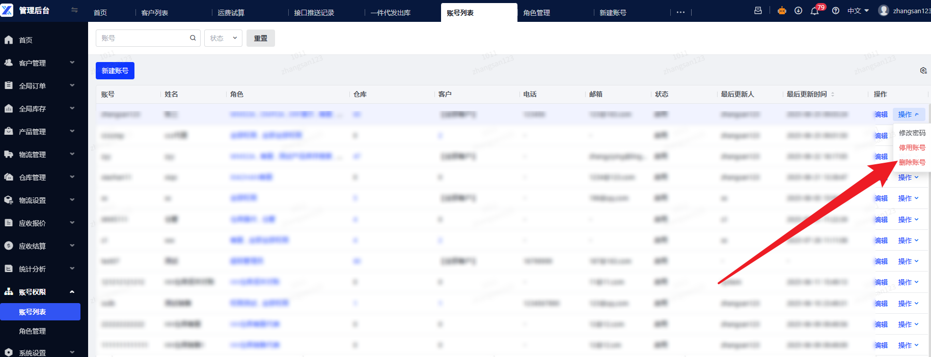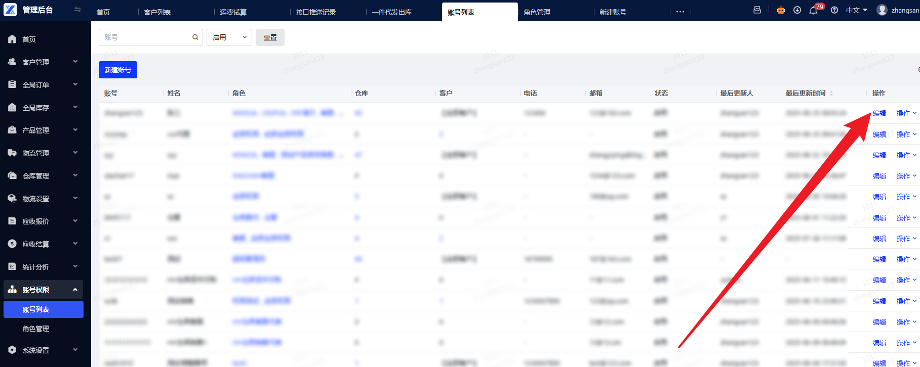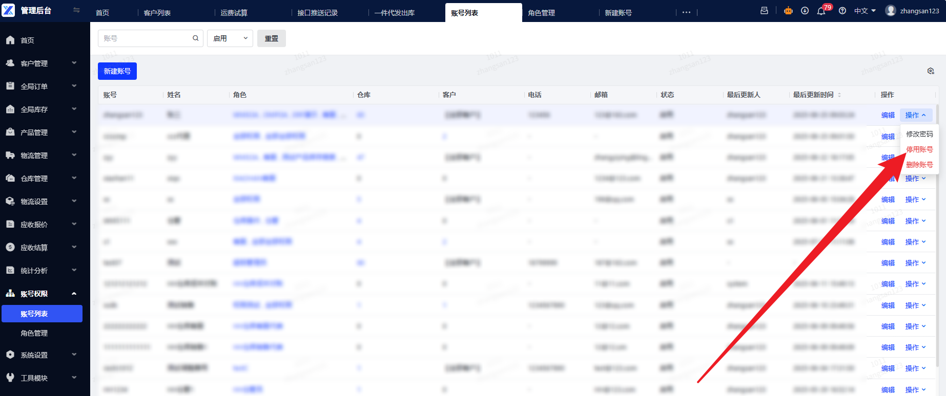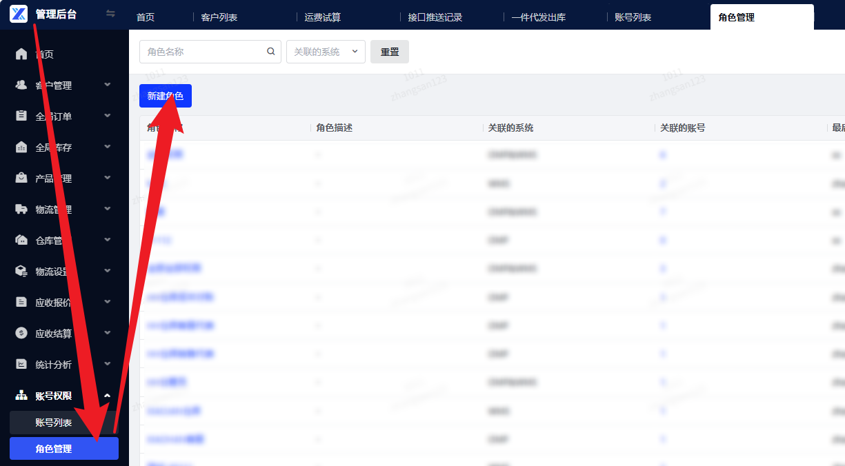 绑定角色权限(2)新建账号新建账号时除填写姓名、账号、密码、邮箱等字段外,还需勾选角色、仓库、客户: