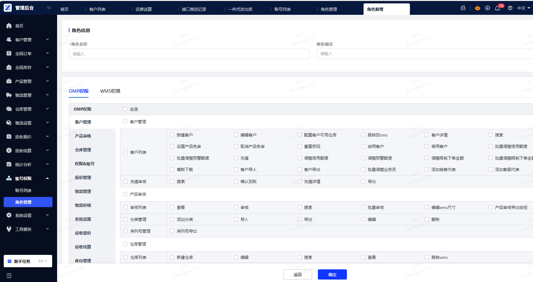 定义:OMP 创建的账号指创建供 OMP/WMS 端使用的账号,创建流程为先创建角色以及角色权限,然后创建账号并绑定角色。