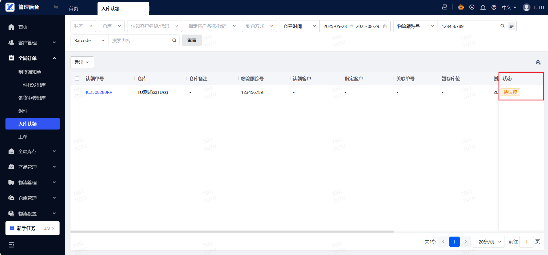 (5)入库认领单状态查阅:定位到入库认领单后,在列表中就可以通过“状态”字段查阅到入库认领单状态。