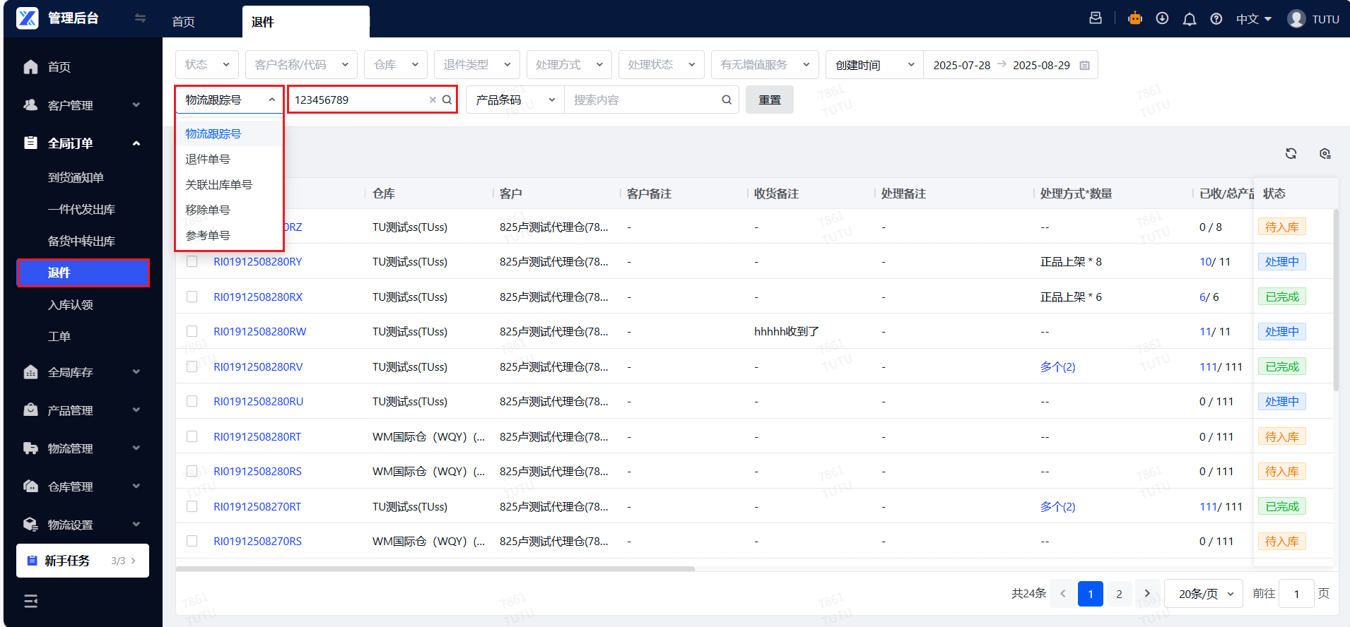 (2)查阅退件单:导航至退件菜单,点击物流跟踪号可以选择搜索字段,输入对应字段后点击搜索,即可定位退件单。