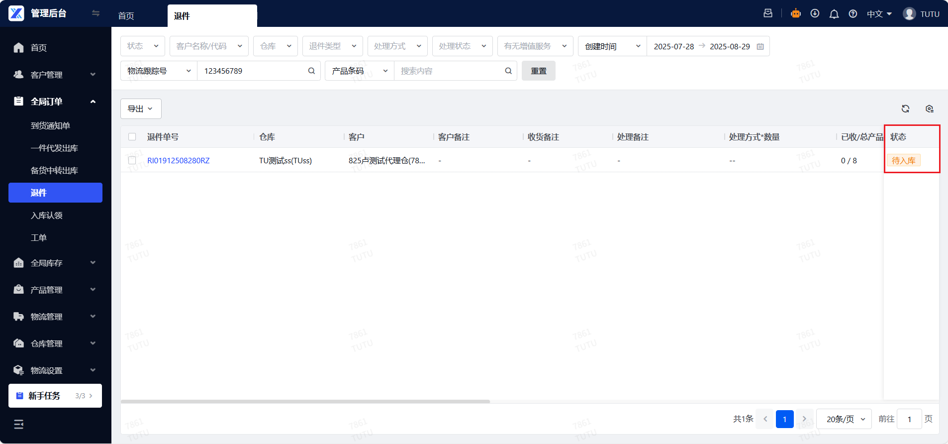 - 待入库:客户在OMS端口创建并提交了退件单 。